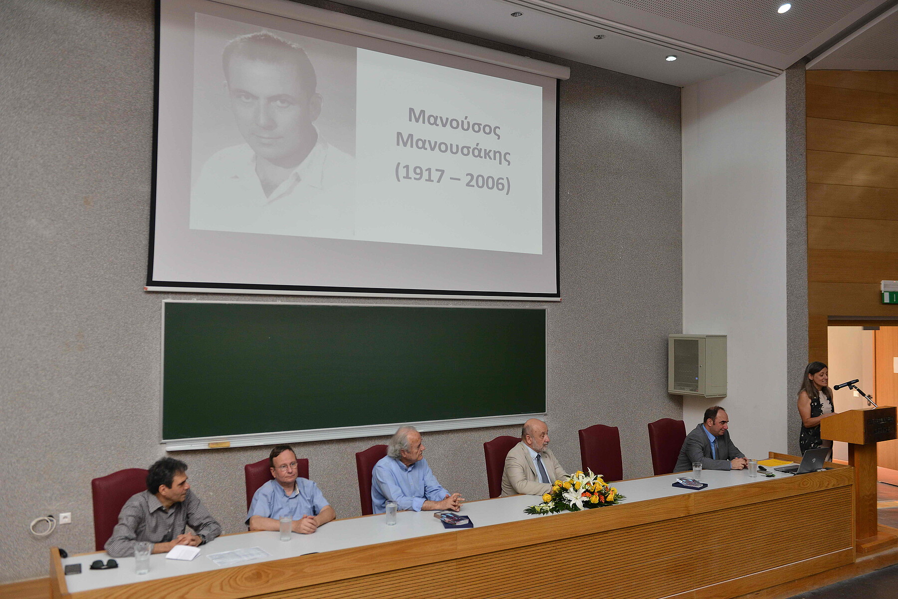 Ο Αντιπρύτανης Διοικητικών Υποθέσεων, Ακαδημαϊκών Υποθέσεων και Φοιτητικής Μέριμνας Αναπληρωτής Καθηγητής Μιχαήλ Γ. Λαγουδάκης, έκανε μία σύντομη αναδρομή, παρουσιάζοντας τόσο ιστορικά, όσο και τεχνικά στοιχεία που αφορούν στα δύο αμφιθέατρα, ξεκινώντας από το 2004 που ολοκληρώθηκε η αρχιτεκτονική μελέτη των κτηρίων έως και την ημερομηνία ονοματοδοσίας. Ο Αντιπρύτανης Έρευνας και διά Βίου Εκπαίδευσης Καθηγητής Μιχαήλ Ζερβάκης, παρουσίασε τα βιογραφικά στοιχεία του Μανούσου Μανουσάκη, ενώ ακολούθησε η αντιφώνηση της Επίκουρης Καθηγήτριας Δάφνης Μανουσάκη, κόρης του Μανούσου Μανουσάκη. Ο Αντιπρύτανης Οικονομικών, Προγραμματισμού και Ανάπτυξης Καθηγητής Νικόλαος Καλλίθρακας-Κόντος, παρουσίασε τα βιογραφικά στοιχεία του Γεωργίου Κατσανεβάκη. Ακολούθησε αντιφώνηση του κ. Κατσανεβάκη.