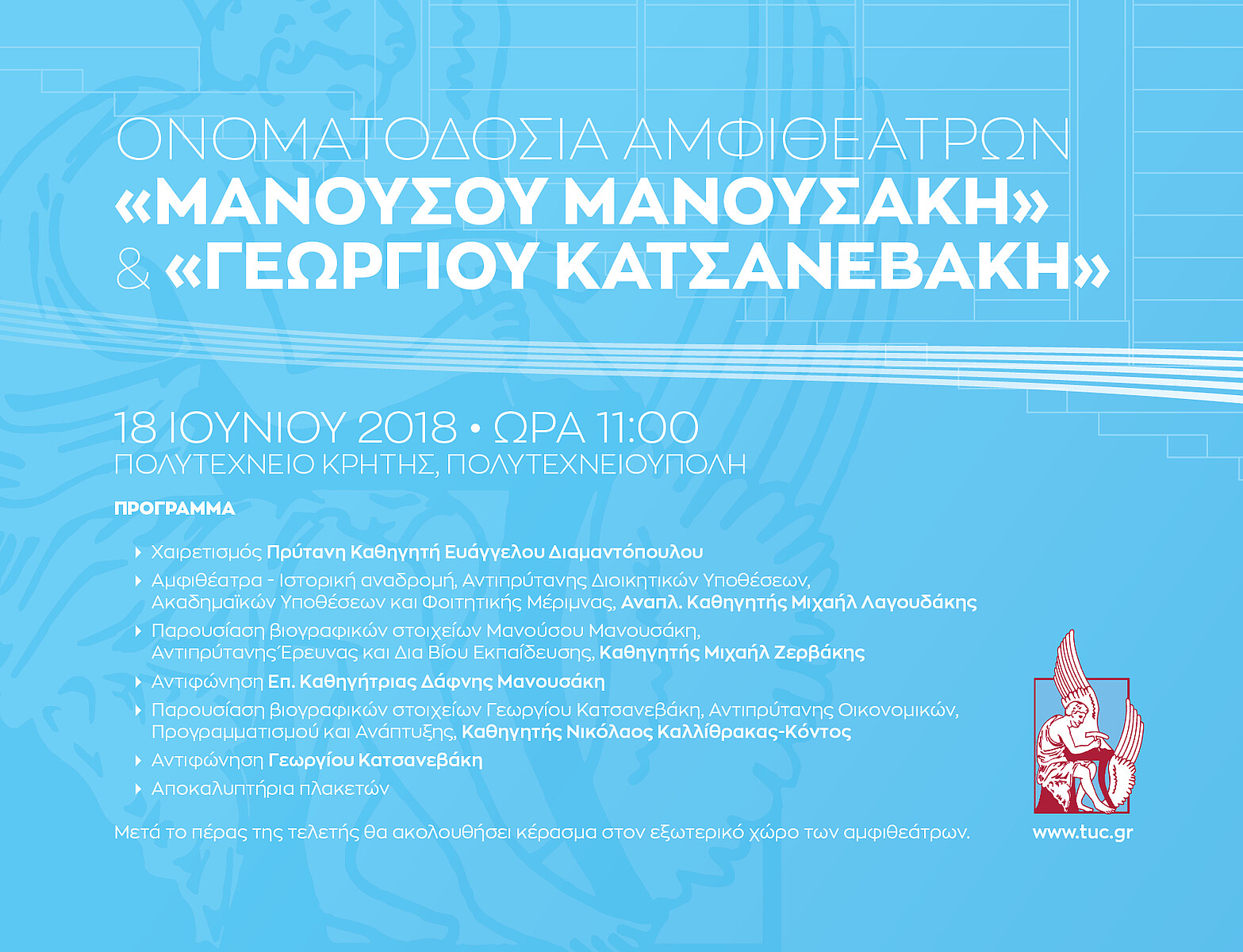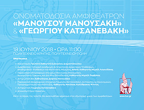 Τη Δευτέρα 18 Ιουνίου 2018 και ώρα 11:00 θα πραγματοποιηθεί στην Πολυτεχνειούπολη η τελετή ονοματοδοσίας των αμφιθεάτρων Γ2.1 και Γ2.2. σε «Αμφιθέατρο Μανούσου Μανουσάκη» και «Αμφιθέατρο Γεωργίου Κατσανεβάκη» αντίστοιχα, σύμφωνα με την απόφαση της 468ης συνεδρίασης της Συγκλήτου ως ένδειξη αναγνώρισης της προσφοράς τους κατά την ίδρυση και την ανάπτυξη του Πολυτεχνείου Κρήτης.