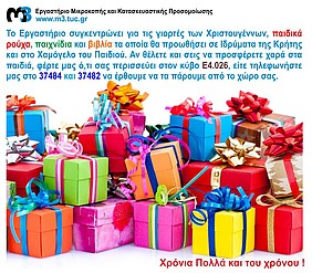Το Εργαστήριο Μικροκοπής & Κατασκευαστικής Προσομοίωσης της Σχολής ΜΠΔ συγκεντρώνει για τις γιορτές των Χριστουγέννων, παιδικά ρούχα, παιχνίδια και βιβλία, τα οποία θα προωθήσει σε Ιδρύματα της Κρήτης και στο Xαμόγελο του Παιδιού.