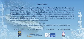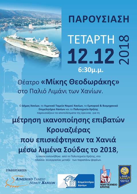 Ο Δήμος Χανίων, το Λιμενικό Ταμείο Νομού Χανίων, το Εμπορικό και Βιομηχανικό Επιμελητήριο Χανίων και το Πολυτεχνείο Κρήτης, διοργανώνουν εκδήλωση που θα πραγματοποιηθεί στο θέατρο "Μίκης Θεοδωράκης" στο Παλιό Λιμάνι Χανίων την Τετάρτη 12 Δεκεμβρίου 2018 και ώρα 6.30 μμ για την παρουσίαση των αποτελεσμάτων της έρευνας για τη μέτρηση ικανοποίησης επιβατών Κρουαζιέρας που επισκέφθηκαν τα Χανιά μέσω λιμένα Σούδας το 2108 και η οποία εκπονήθηκε από το Πολυτεχνείο Κρήτης στο πλαίσιο συνεργασίας μεταξύ των παραπάνω φορέων.