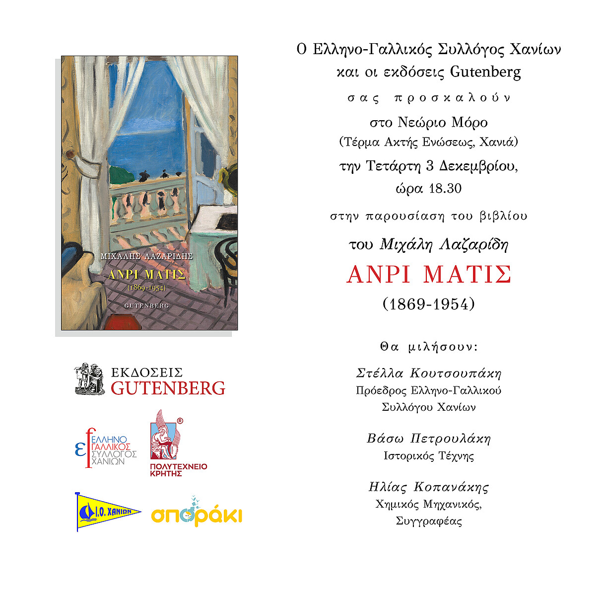 Το βιβλίο του Καθηγητή Μιχάλη Λαζαρίδη της Σχολής Χημικών Μηχανικών και Μηχανικών Περιβάλλοντος του Πολυτεχνείου Κρήτης, με τίτλο «Ανρί Ματίς (1869-1954)» των εκδόσεων Gutenberg, παρουσιάζεται σε εκδήλωση που διοργανώνουν ο Ελληνο-Γαλλικός Σύλλογος Χανίων και οι εκδόσεις Gutenberg, την Τετάρτη 3 Δεκεμβρίου 2025 και ώρα 18:30, στο Νεώριο Μόρο (Τέρμα Ακτής Ενώσεως, Χανιά).