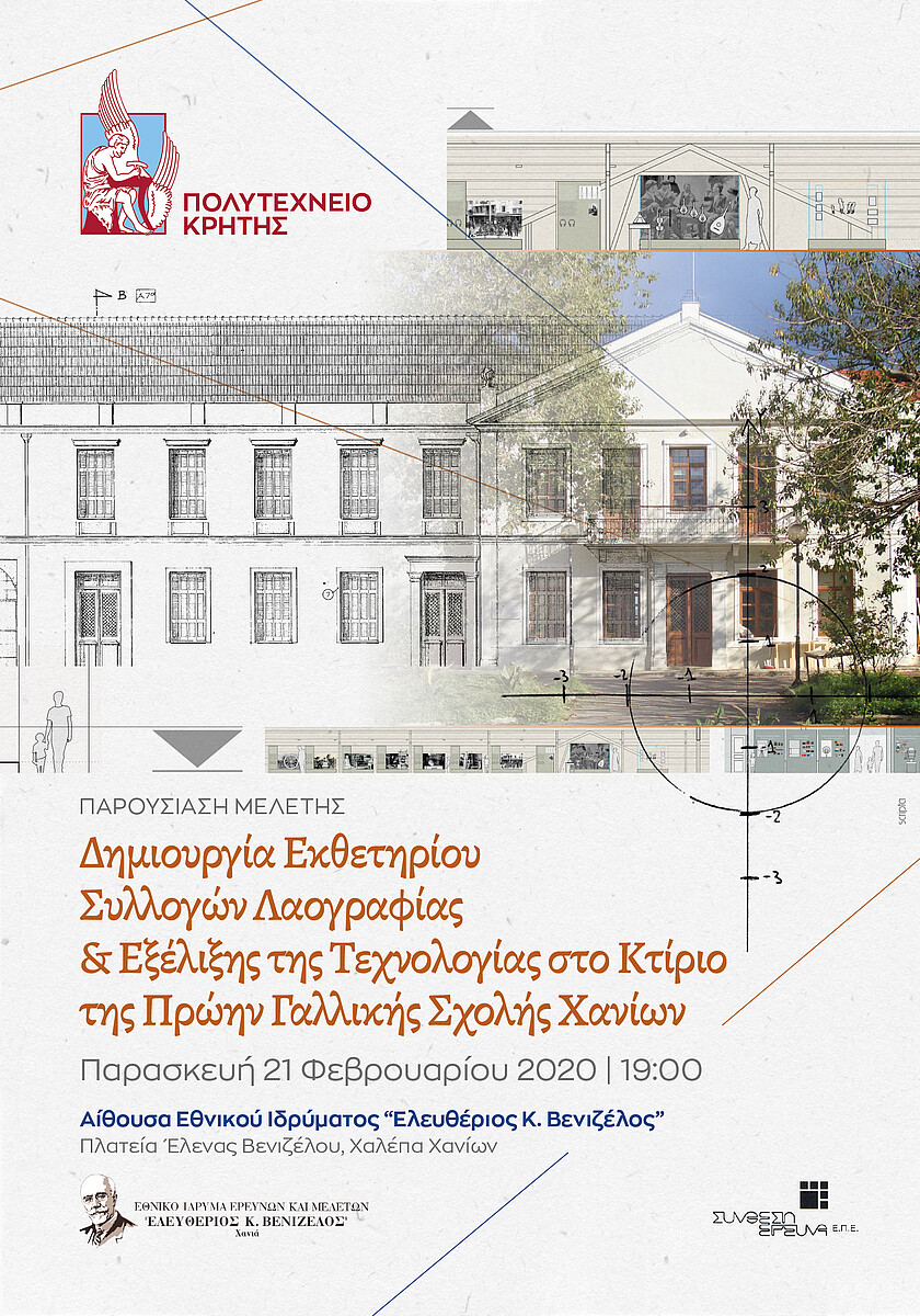 Η Πρυτανεία του Πολυτεχνείου Κρήτης έχει την τιμή να σας προσκαλέσει στην Εκδήλωση Παρουσίασης της Μελέτης για την Δημιουργία Εκθετηρίου Συλλογών Λαογραφίας και Εξέλιξης της Τεχνολογίας στο Κτίριο της Πρώην Γαλλικής Σχολής που θα πραγματοποιηθεί την Παρασκευή 21 Φεβρουαρίου 2020 και ώρα 19:00, στην Αίθουσα "Σταύρος Σ. Νιάρχος" στο Kτίριο Διοικητικών και Επιστημονικών Υπηρεσιών του Εθνικού Ιδρύματος "Ελευθέριος Κ. Βενιζέλος", Πλατεία Έλενας Βενιζέλου, Χαλέπα Χανίων.