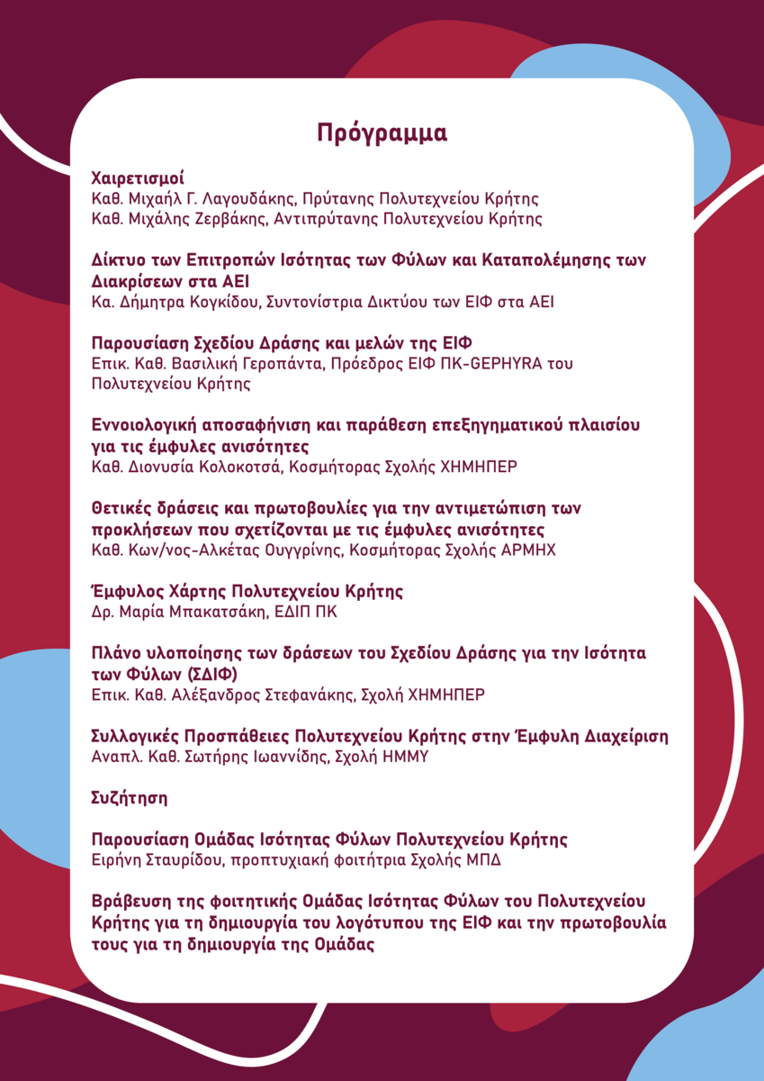 Η Επιτροπή Ισότητας Φύλων (ΕΙΦ) του Πολυτεχνείου Κρήτης διοργανώνει ανοικτή ενημερωτική εκδήλωση για την
