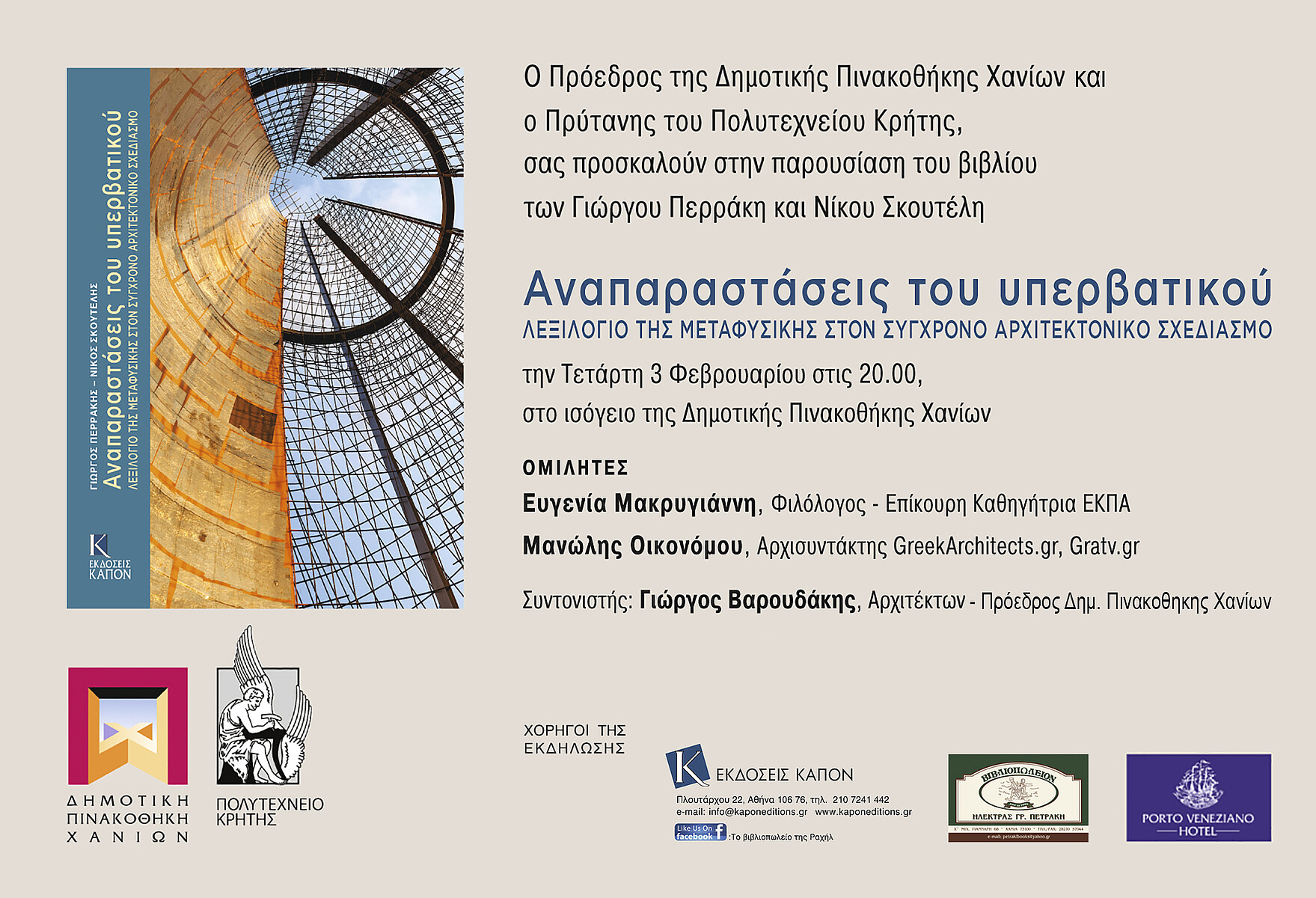 Την Τετάρτη 3 Φεβρουαρίου 2016, στις 20.00 στην Δημοτική Πινακοθήκη Χανίων θα γίνει παρουσίαση του βιβλίου του Νικολάου Σκουτέλη, Αναπλ. Καθηγητή της Σχολής Αρχιτεκτόνων Μηχανικών του Πολυτεχνείου Κρήτης, με τίτλο Αναπαραστάσεις του υπερβατικού-Λεξιλόγιο της μεταφυσικής στον σύγχρονο αρχιτεκτονικό σχεδιασμό.