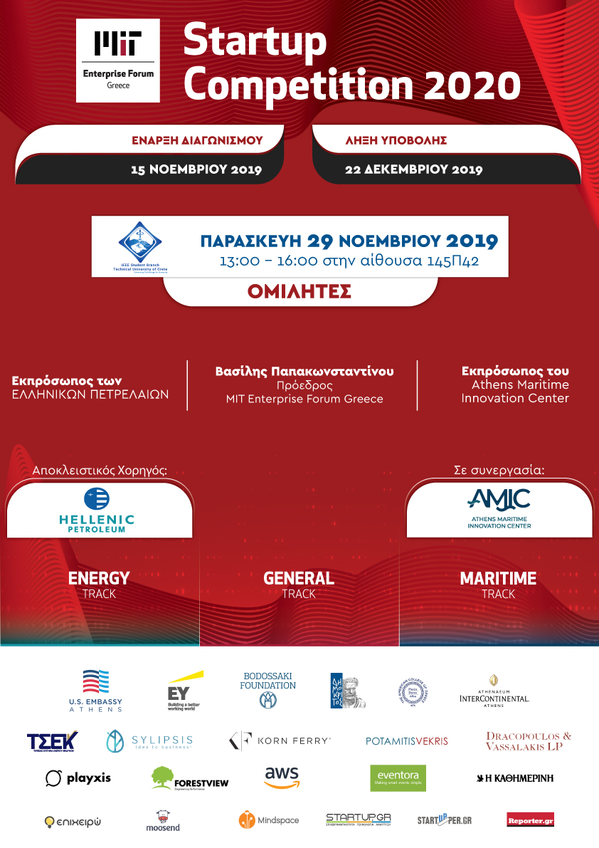 Το MIT Enterprise Forum Greece, σε συνεργασία με το IEEE TUC Student Branch, διοργανώνει ανοιχτή εκδήλωση παρουσίασης του “MITEF Greece Startup Competition 2020”. Η εκδήλωση θα πραγματοποιηθεί την Παρασκευή 29 Νοεμβρίου 2019, στo Πολυτεχνείο Κρήτης, Κτίριο Επιστημών, στην αίθουσα 145.Π.42 από τις 13:00 – 16:00. Σκοπός της εκδήλωσης είναι η ενημέρωση ερευνητών και νεοφυών επιχειρήσεων σχετικά με το “MITEF Greece Startup Competition 2020”. Το MITEF Greece στοχεύει στη δυναμική ανάπτυξη νεοφυών επιχειρήσεων και επιχειρηματικών ομάδων που καινοτομούν στο χώρο της τεχνολογίας και των επιστημών.
