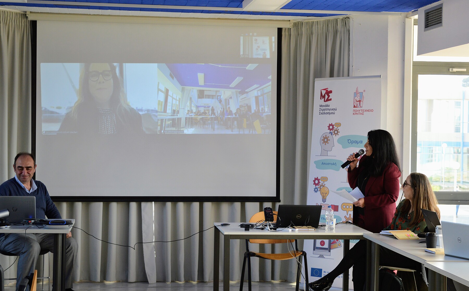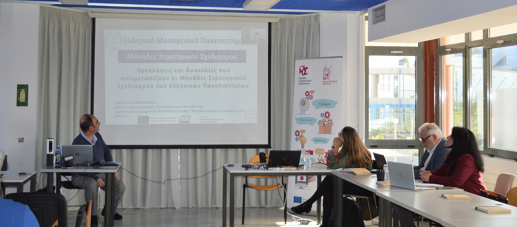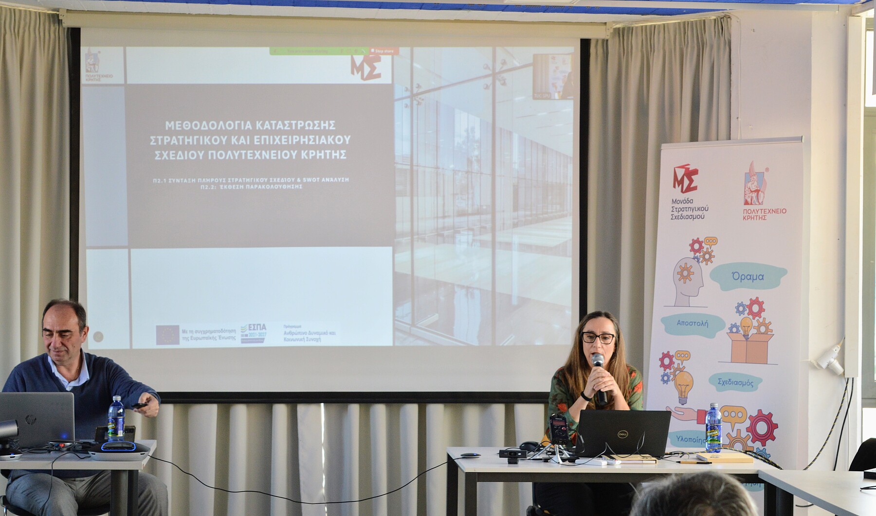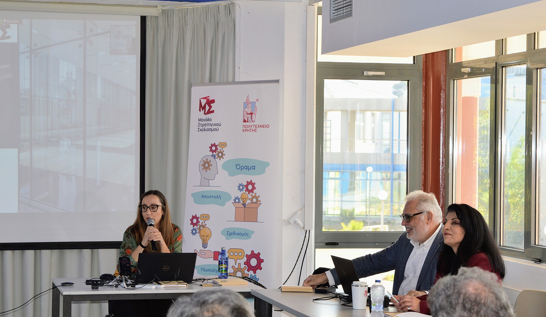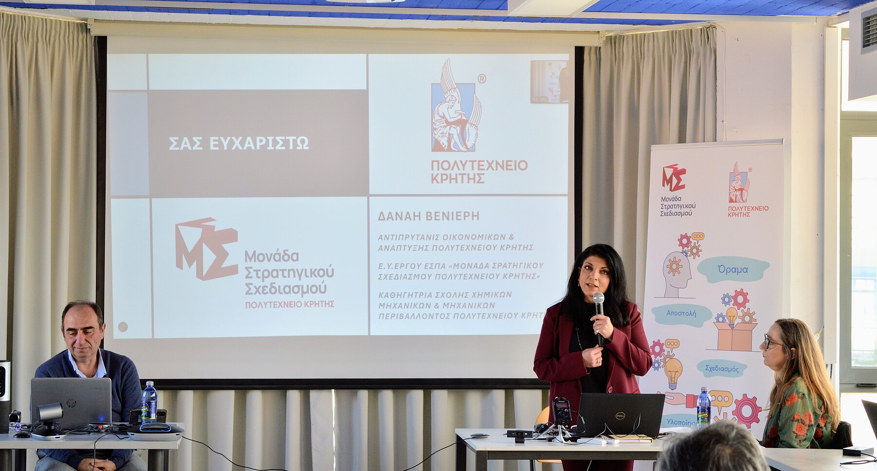 Κατά την έναρξη της Ημερίδας η Καθηγήτρια Δανάη Βενιέρη, Αντιπρύτανις Οικονομικών και Ανάπτυξης του Πολυτεχνείου Κρήτης και Επιστημονικά Υπεύθυνη Έργου, παρουσίασε την «Οργάνωση και Λειτουργία της Μονάδας Στρατηγικού Σχεδιασμού του Πολυτεχνείου Κρήτης» και τον «Στρατηγικό και Επιχειρησιακό Σχεδιασμό του Πολυτεχνείου Κρήτης».