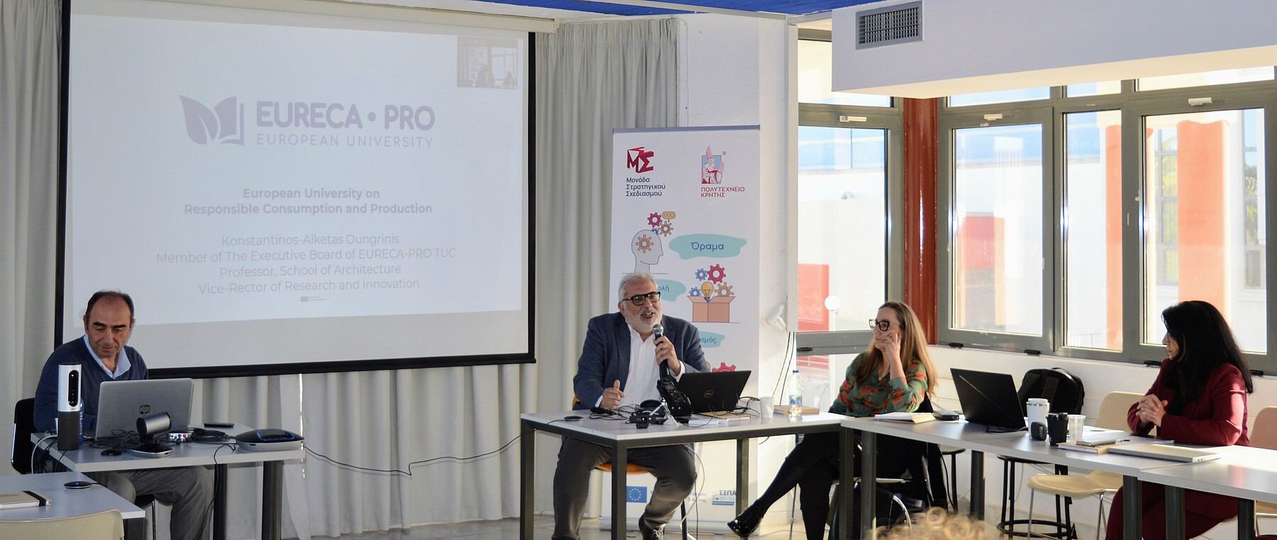 Το δεύτερο μέρος της εκδήλωσης έκλεισε ο Καθηγητής Κωνσταντίνος-Αλκέτας Ουγγρίνης, Αντιπρύτανης Έρευνας και Καινοτομίας του Πολυτεχνείου Κρήτης, EURECA-PRO Executive Board Member, με την παρουσίαση με τίτλο «EURECA-PRO: Το Ευρωπαϊκό Πανεπιστήμιο για την Υπεύθυνη Κατανάλωση και Παραγωγή».