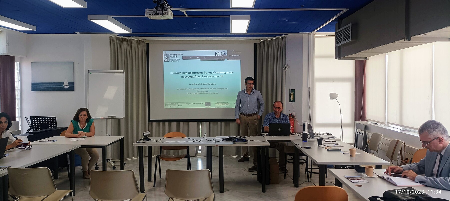Πραγματοποιήθηκε την Τρίτη 17 Οκτωβρίου 2023, στην κεντρική αίθουσα του Γλωσσικού Κέντρου του Πολυτεχνείου Κρήτης, η ημερίδα με τίτλο «Η Διασφάλιση της Ποιότητας στο Πολυτεχνείο Κρήτης: Εξελίξεις και Προοπτικές». Η εν λόγω ημερίδα διοργανώθηκε στο πλαίσιο του έργου ΕΣΠΑ «Αναβάθμιση, Εκσυγχρονισμός και Υποστήριξη της Μονάδας Διασφάλισης Ποιότητας (ΜΟΔΙΠ) του Πολυτεχνείου Κρήτης (ΠΚ)» της Πράξης «Αναβάθμιση της Ποιότητας των ΑΕΙ, για την Αποτελεσματικότερη και Αποδοτικότερη Λειτουργία τους - Υποστήριξη των ΜΟΔΙΠ», του Επιχειρησιακού Προγράμματος «Ανάπτυξη Ανθρώπινου Δυναμικού, Εκπαίδευση και Διά Βίου Μάθηση».