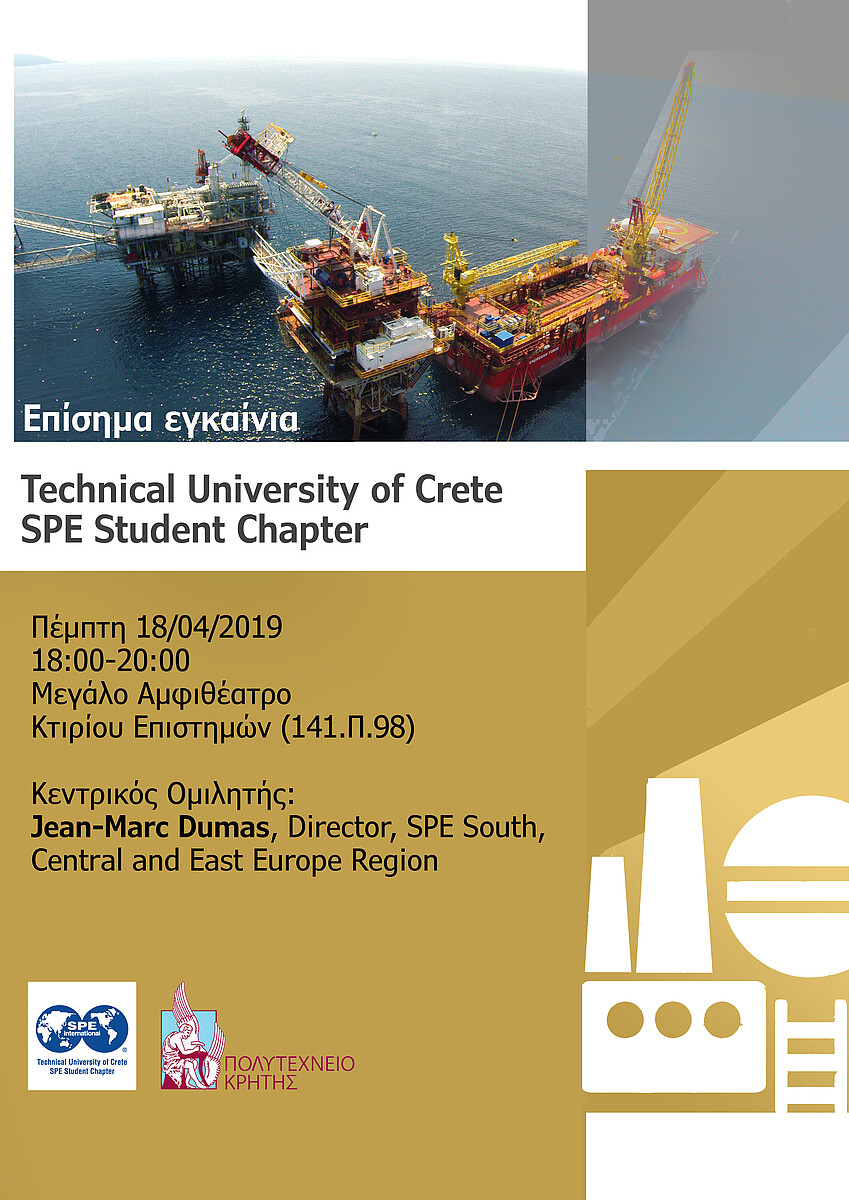 Τα εγκαίνια του TUC SPE Student Chapter, θα πραγματοποιηθούν την Πέμπτη 18 Απριλίου 2019 και ώρες 18:00-20:00, στο Μεγάλο Αμφιθέατρο (141.Π.98) του Κτηρίου Επιστημών, στην Πολυτεχνειούπολη. Η SPE (Society of Petroleum Engineers) είναι η μεγαλύτερη κοινότητα μηχανικών, επιστημόνων και επαγγελματιών σε παγκόσμιο επίπεδο, που ασχολούνται με την έρευνα και εκμετάλλευση κοιτασμάτων υδρογονανθράκων. Μέσω της Σχολής Μηχανικών Ορυκτών Πόρων, τον Οκτώβριο του 2018, το Πολυτεχνείο Κρήτης απέκτησε το φοιτητικό παράρτημα Technical Univeristy of Crete SPE Student Chapter.