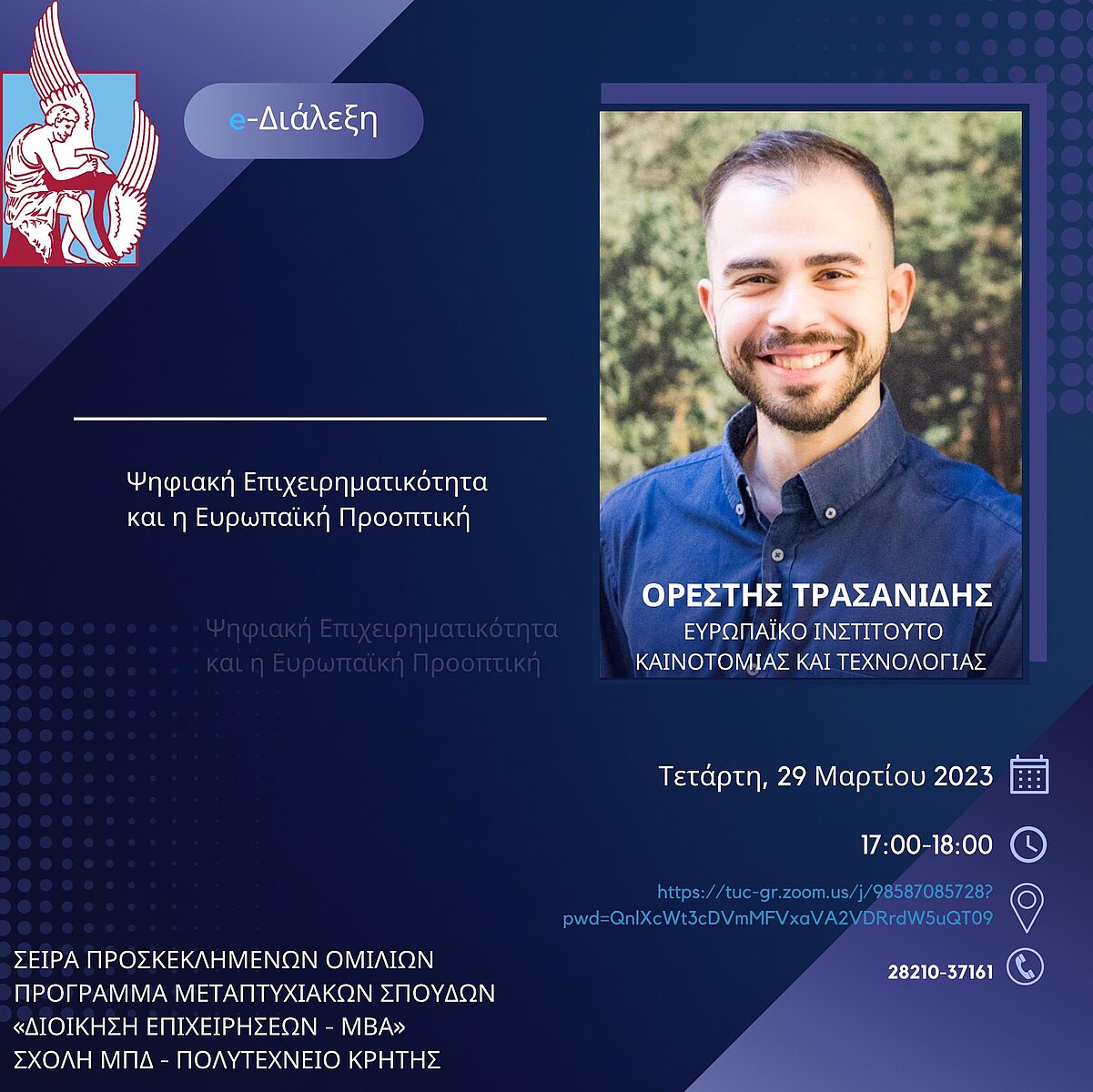 Στο πλαίσιο της σειράς προσκεκλημένων ομιλιών που διοργανώνει το Πρόγραμμα Μεταπτυχιακών Σπουδών «Διοίκηση Επιχειρήσεων – ΜΒΑ» της Σχολής Μηχανικών Παραγωγής και Διοίκησης (ΜΠΔ), την Τετάρτη 29 Μαρτίου 2023 και ώρα 17:00-18:00, θα πραγματοποιηθεί ομιλία από τον κ. Ορέστη Τρασανίδη, Μηχανολόγο Μηχανικό MSc, AI Leader στο European Institute of Technology and Innovation - EIT Digital, με θέμα