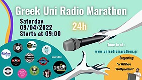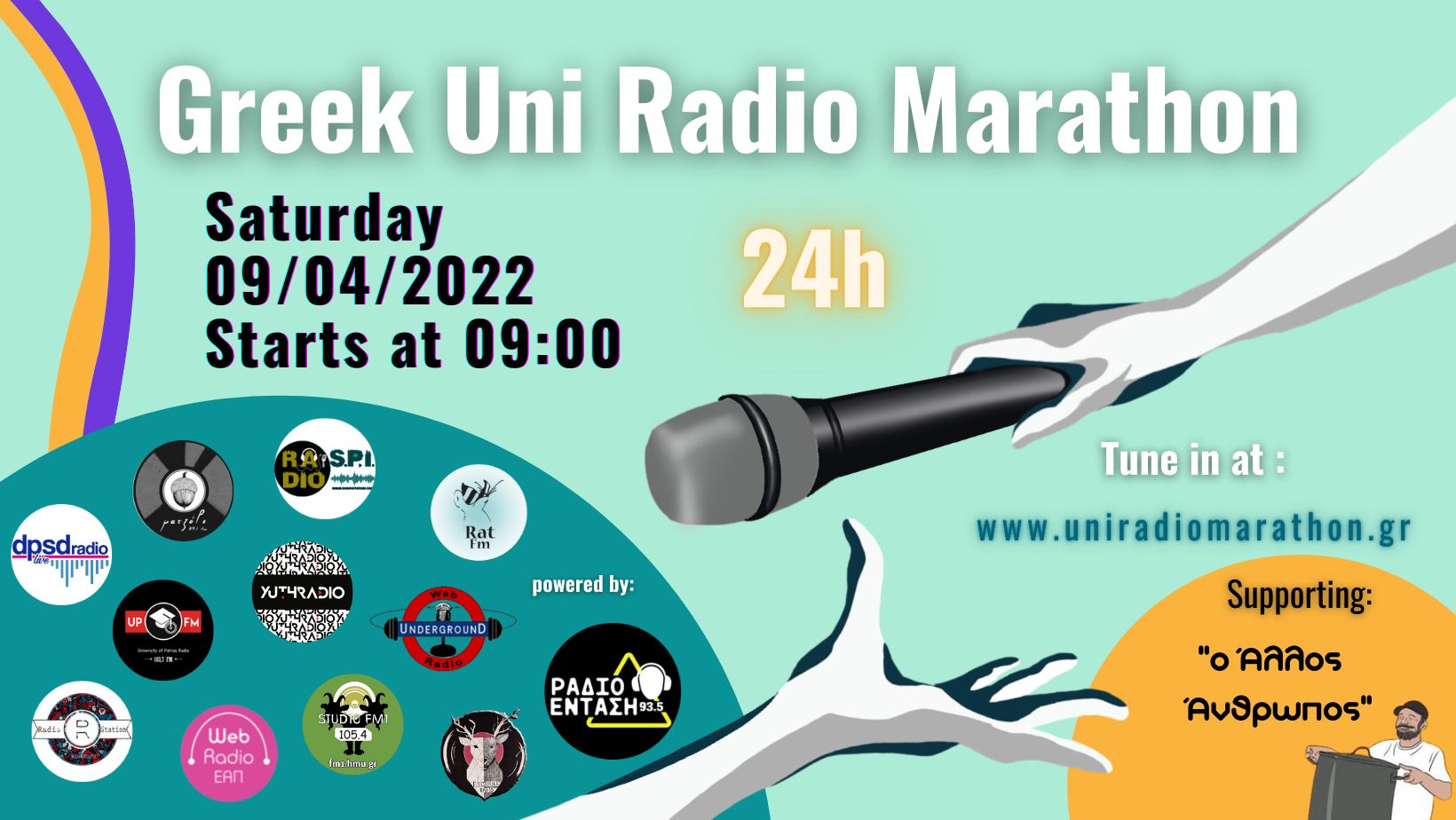 Το Greek Uni Radio Marathon έρχεται το Σάββατο 9 Απριλίου 2022 με ώρα έναρξης στις 9 το πρωί και 24ωρο πρόγραμμα, με την συμμετοχή 12 φοιτητικών ραδιοσταθμών από κάθε άκρη της Ελλάδας. Συντονιστείτε σε ένα πρόγραμμα γεμάτο μουσική, συνεντεύξεις και αφιερώματα, με θέμα την ιστορία των φοιτητικών ραδιοφώνων.