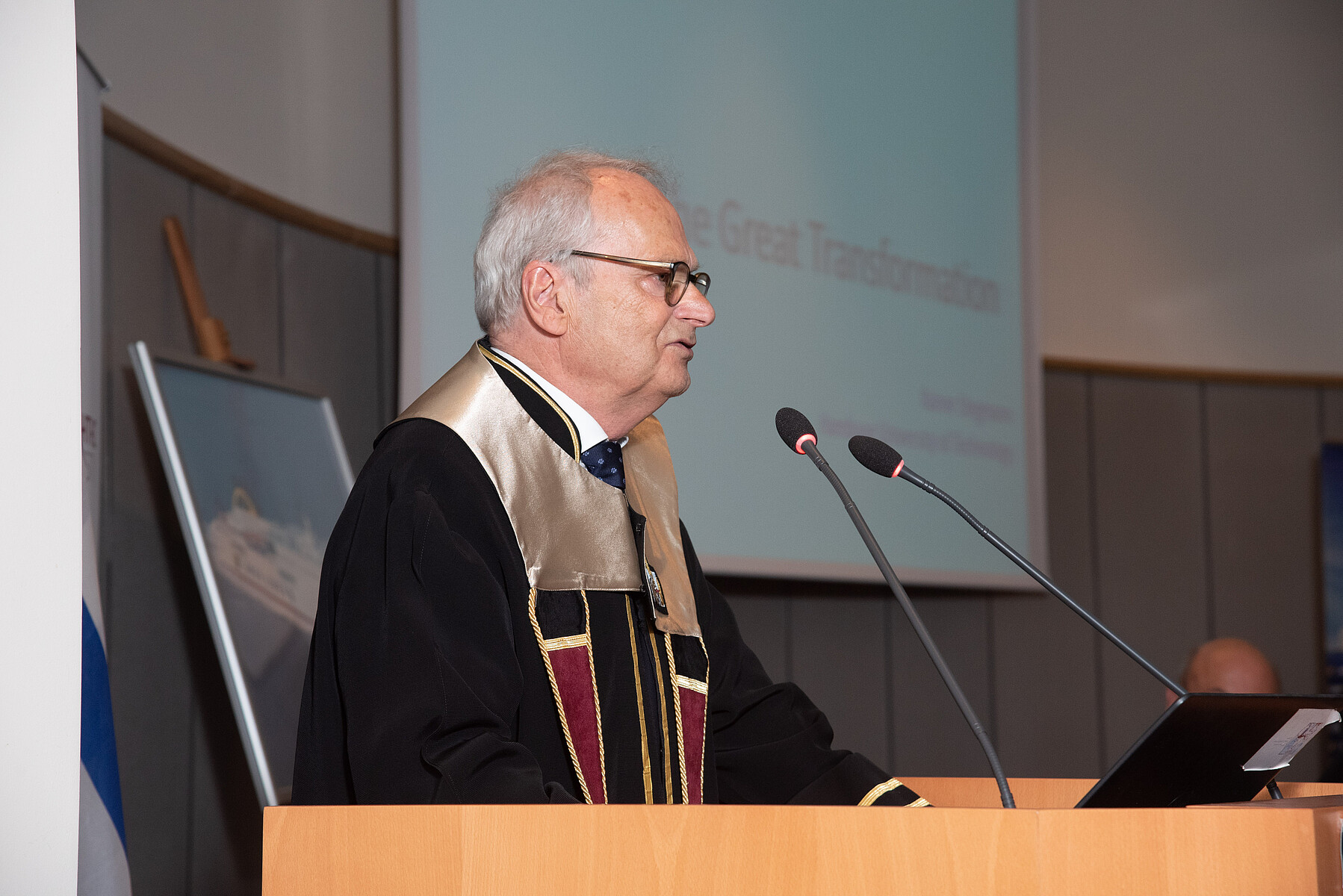 Η Τελετή έκλεισε με την αντιφώνηση του τιμώμενου Καθηγητή Rainer Stegmann, o oποίος έδωσε ομιλία με τίτλο "The Great Transformation", όπου παρουσιάστηκαν οι πιεστικές προκλήσεις που βιώνουμε σε παγκόσμιο επίπεδο και αφορούν στην κλιματική αλλαγή, τη ρύπανση του πλανήτη και τους περιορισμένους φυσικούς πόρους, τα ερωτήματα που εγείρονται σχετικά με την υποβάθμιση του περιβάλλοντος και πως απαντάμε επιστημονικά σε αυτά, με νέους στόχους και μεγάλες, σημαντικές αλλαγές που πρέπει να γίνουν σε όλους τους τομείς της ζωής μας.