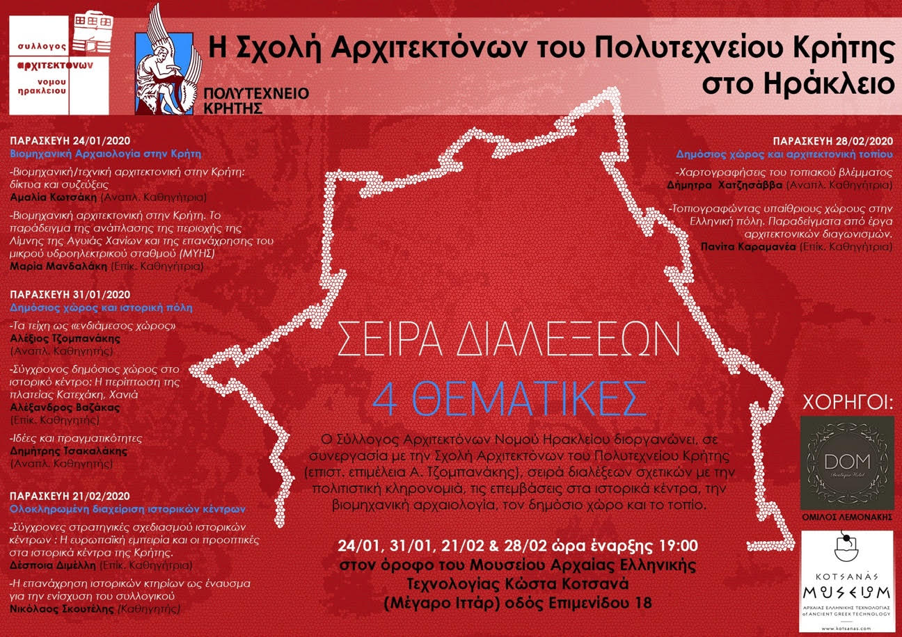 Ο Σύλλογος Αρχιτεκτόνων Νομού Ηρακλείου (ΣΑΝΗ) σε συνεργασία με την Σχολή Αρχιτεκτόνων Μηχανικών του Πολυτεχνείου Κρήτης, διοργανώνει σειρά διαλέξεων σχετικών με την πολιτιστική κληρονομιά (ειδικότερα με τις επεμβάσεις στα ιστορικά κέντρα), την βιομηχανική αρχαιολογία, τον δημόσιο χώρο και το τοπίο. Σε κάθε συνάντηση, οι ομιλητές - διδάσκοντες της Σχολής Αρχιτεκτόνων Μηχανικών του Πολυτεχνείου Κρήτης,θα αναλύσουν και θα παρουσιάσουν την κάθε θεματική από άποψη και ιστορική ή θεωρητική, αλλά και με έναν περισσότερο «απτό» τρόπο, δηλαδή μέσω εφαρμοσμένου έργου ή βραβευμένων μελετών αρχιτεκτονικών διαγωνισμών.