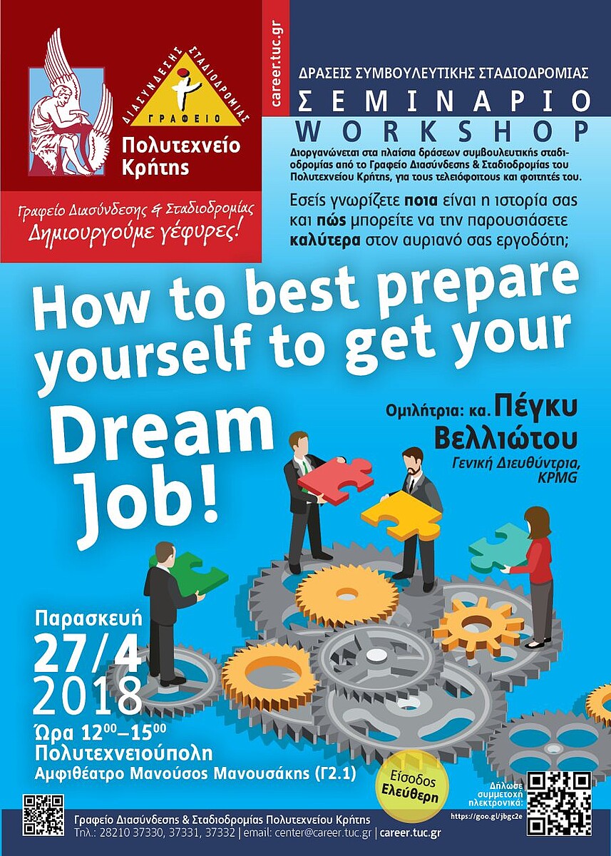 Στo πλαίσιο των δράσεων συμβουλευτικής σταδιοδρομίας το Γραφείο Διασύνδεσης & Σταδιοδρομίας του Πολυτεχνείου Κρήτης διοργανώνει workshop για τους τελειόφοιτους και τους φοιτητές του Πολυτεχνείου Κρήτης, την Παρασκευή 27 Απριλίου 2018 και ώρες 12:00 έως 15:00 στο Αμφιθέατρο Μανούσος Μανουσάκης (Γ2.1). Ομιλήτρια θα είναι η κα. Πέγκυ Βελλιώτου, Γενική Διευθύντρια της KPMG.