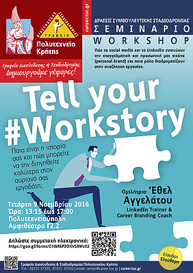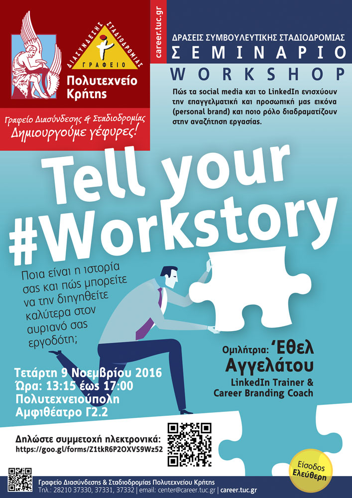 Tο Γραφείο Διασύνδεσης & Σταδιοδρομίας του Πολυτεχνείου Κρήτης, στο πλαίσιο των δράσεων του διοργανώνει σεμινάριο συμβουλευτικής σταδιοδρομίας με την μορφή workshop με θέμα «Πώς τα social media και το LinkedIn ενισχύουν την επαγγελματική και προσωπική μας εικόνα (personal brand) και ποιο ρόλο διαδραματίζουν στην αναζήτηση εργασίας» για τους τελειόφοιτους και τους φοιτητές του Πολυτεχνείου Κρήτης.