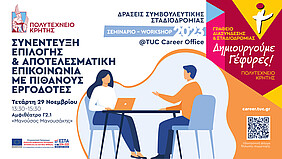 Περισσότερες πληροφορίες στο Facebook Event και στο Γραφείο Διασύνδεσης και Σταδιοδρομίας (τηλέφωνα: 28210-37331, 28210-37332, email: career-center<στο>tuc.gr).