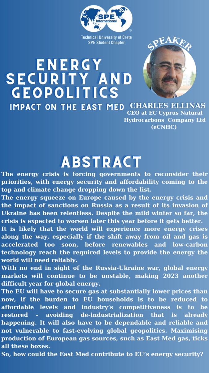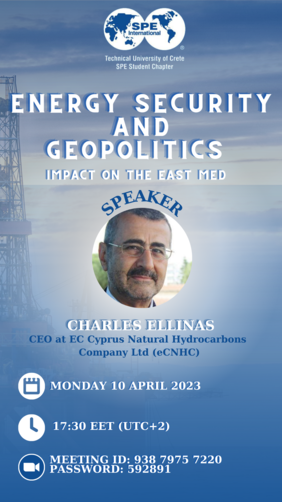 Το Φοιτητικό Παράρτημα της Society of Petroleum Engineers (SPE) στο Πολυτεχνείο Κρήτης διοργανώνει τη Δευτέρα 10 Απριλίου 2023 και ώρα 17:30 διαδικτυακή εκδήλωση με προσκεκλημένο ομιλητή τον Dr. Charles Ellinas, CEO της EC Cyprus Natural Hydrocarbons Company Ltd (eCNHC). Ο τίτλος της ομιλίας του είναι: