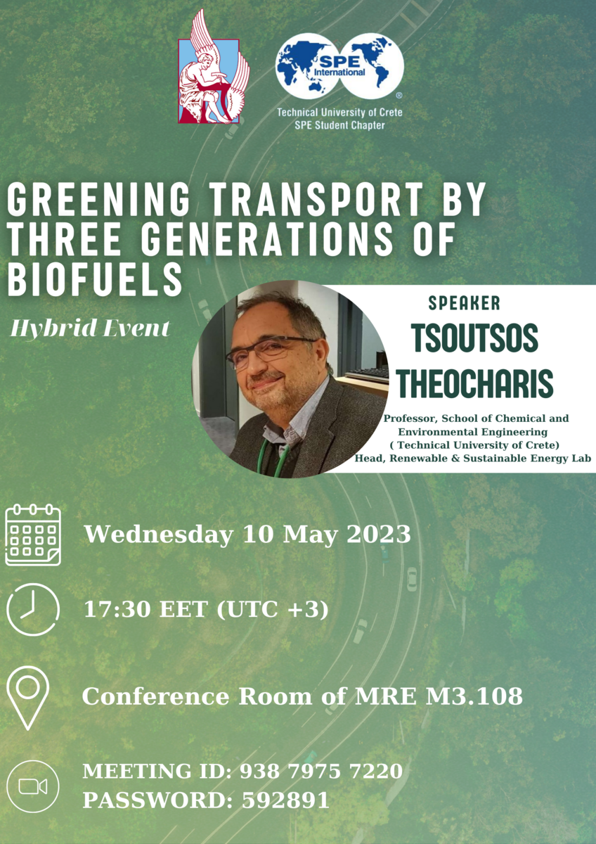 Το Φοιτητικό Παράρτημα της Society of Petroleum Engineers (SPE) στο Πολυτεχνείο Κρήτης διοργανώνει τη Τρίτη 10 Μαΐου 2023 και ώρα 17:30 υβριδική εκδήλωση με προσκεκλημένο ομιλητή τον Δρ. Θεοχάρη Τσούτσο, Καθηγητή της Σχολής Χημικών Μηχανικών και Μηχανικών Περιβάλλοντος (ΧΗΜΗΠΕΡ) του Πολυτεχνείου Κρήτης και Διευθυντή του Εργαστηρίου Ανανεώσιμων και Βιώσιμων Ενεργειακών Συστημάτων.