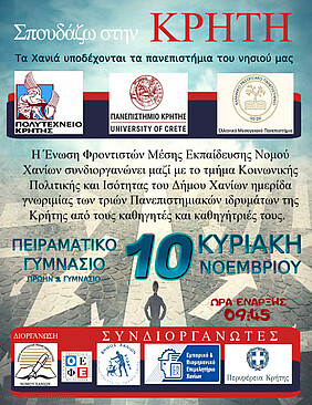 Η ημερίδα πραγματοποιείται στο πλαίσιο των εκπαιδευτικών δράσεων της Ένωσης Φροντιστών Μέσης Εκπαίδευσης Νομού Χανίων, με σκοπό να γνωρίσουν οι μαθήτριες και οι μαθητές το πρόγραμμα σπουδών, τις επιλογές για μεταπτυχιακές σπουδές και τις προοπτικές για επαγγελματική σταδιοδρομία κάθε πανεπιστημιακής σχολής.