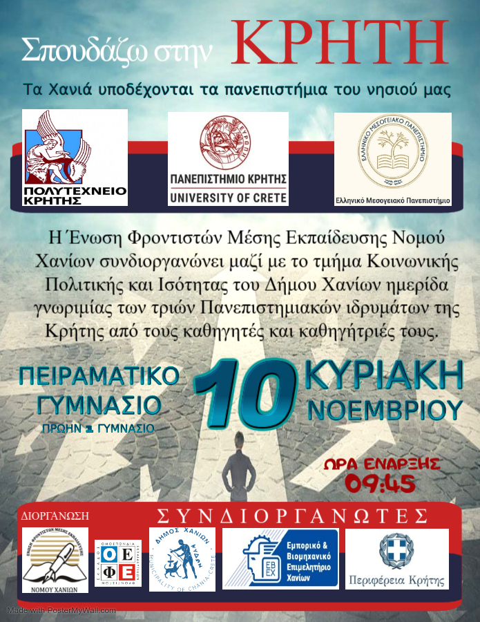 Το Πολυτεχνείο Κρήτης συμμετέχει στην Ημερίδα Προβολής των Σχολών των Πανεπιστημιακών Ιδρυμάτων της Κρήτης, που διοργανώνει η Ένωση Φροντιστών Μέσης Εκπαίδευσης Νομού Χανίων, με την ευγενική υποστήριξη του Τμήματος Κοινωνικής Πολιτικής του Δήμου Χανίων, της Περιφέρειας Κρήτης και του Εμπορικού και Βιομηχανικού Επιμελητηρίου Χανίων, την Κυριακή 10 Νοεμβρίου 2024 και ώρες 10:00-13:30 στο 1ο Πειραματικό Γυμνάσιο Χανίων.