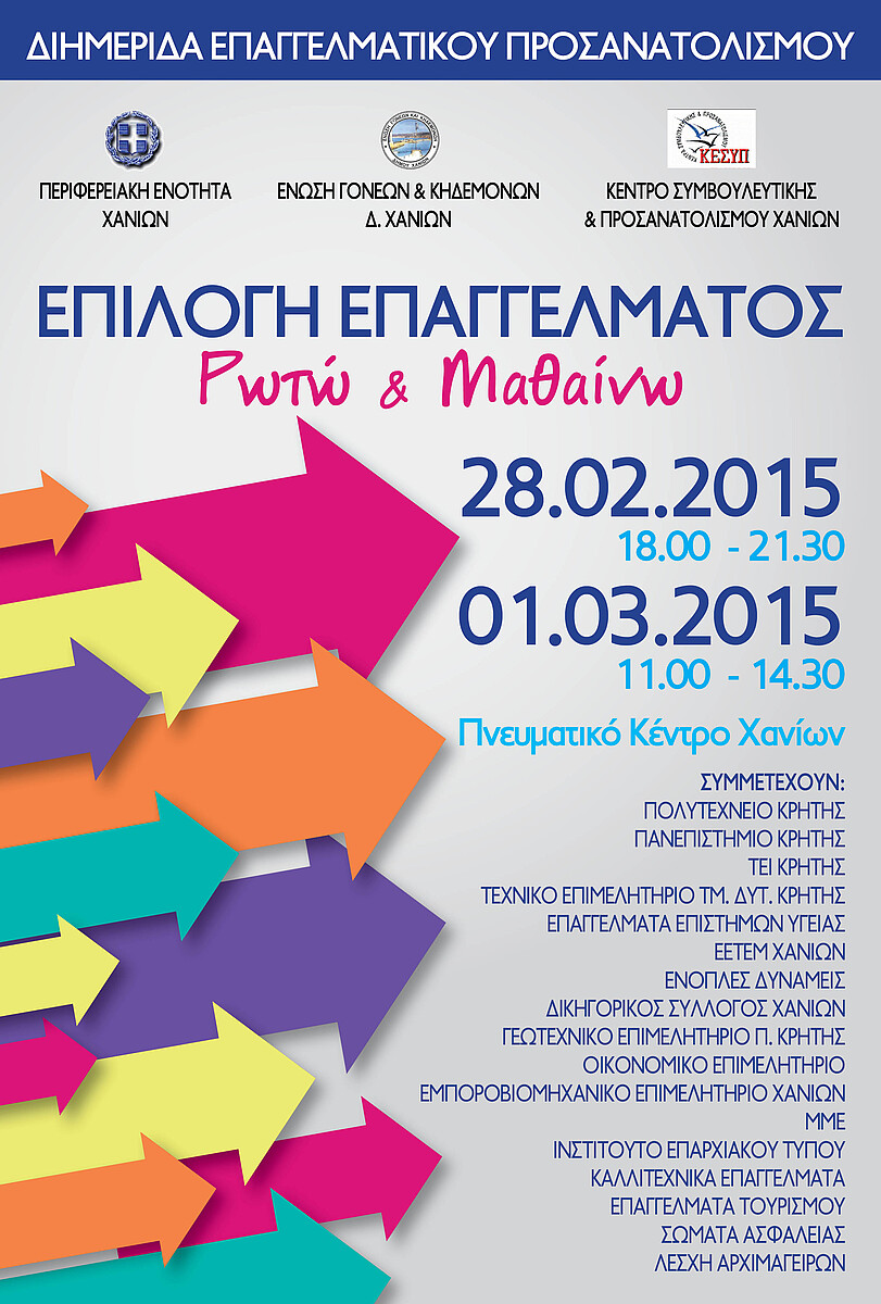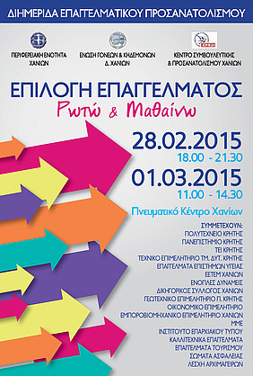 Το Πολυτεχνείο Κρήτης συμμετείχε στην Διημερίδα για τον Επαγγελματικό Προσανατολισμό, που διοργάνωσε η Ένωση Γονέων & Κηδεμόνων Δ. Χανίων, η Περιφερειακή Ενότητα Χανίων–Τμήμα Δια Βίου Μάθησης, Παιδείας και Απασχόλησης και το ΚΕΣΥΠ Χανίων.