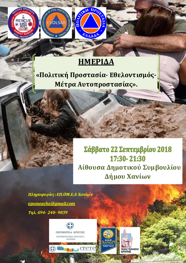 Η Επίλεκτη Ομάδα Ειδικών Αποστολών (ΕΠ.ΟΜ.Ε.Α) του Δήμου Χανίων διοργάνωσε Ημερίδα με θέμα "Πολιτική Προστασία - Εθελοντισμός - Μέτρα Αυτοπροστασίας", στην Αίθουσα του Δημοτικού Συμβουλίου του Δήμου Χανίων, το Σάββατο 22 Σεπτεμβρίου.