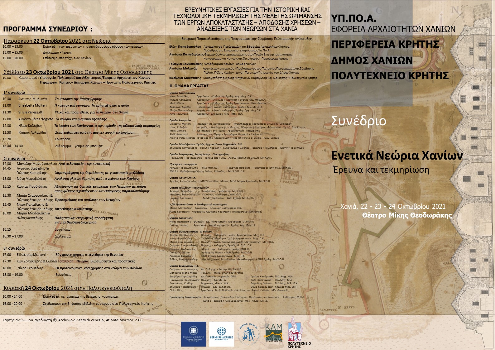 Ειδικότερα, το Σάββατο 23 Οκτωβρίου 2021, από 10:00 έως 19:00, πρόκειται να διεξαχθεί το ανοικτό στο κοινό μέρος του Συνεδρίου, το οποίο θα φιλοξενηθεί στο Θέατρο «Μίκης Θεοδωράκης» που αποτελεί προέκταση των Νεωρίων στο παλιό λιμάνι των Χανίων. Το πρόγραμμα της ημέρας αυτής περιλαμβάνει σειρά ομιλιών που στρέφονται γύρω από το έργο «Ερευνητικές Εργασίες για την Ιστορική και Τεχνολογική Τεκμηρίωση της Μελέτης Ωρίμανσης των Έργων Αποκατάστασης - Απόδοσης Χρήσεων - Ανάδειξης των Νεωρίων στα Χανιά». Οι ομιλίες θα δοθούν από μέλη της ομάδας εργασίας, με την ευκαιρία της ολοκλήρωσης της πρώτης φάσης του έργου, με στόχο την τεκμηριωμένη και πλήρη ενημέρωση όλων των ενδιαφερομένων για την πρόοδό του.