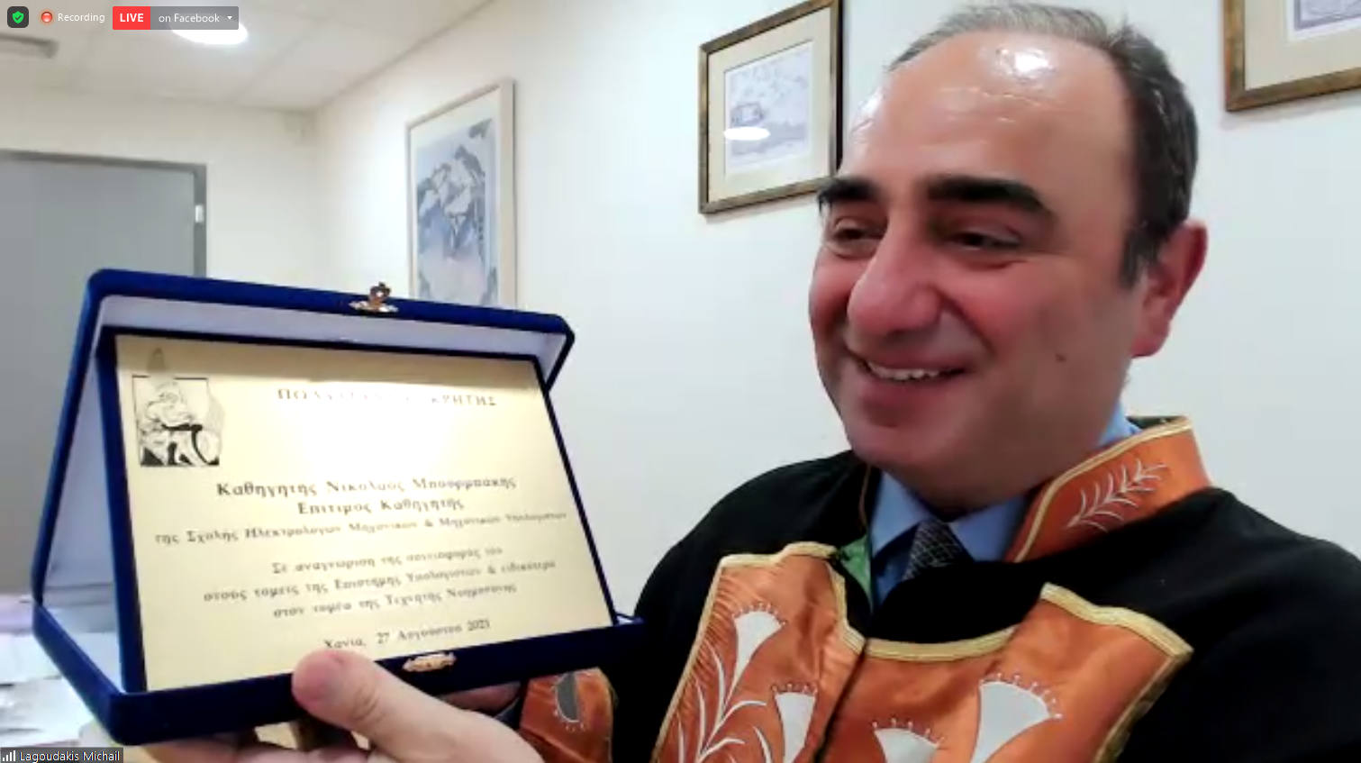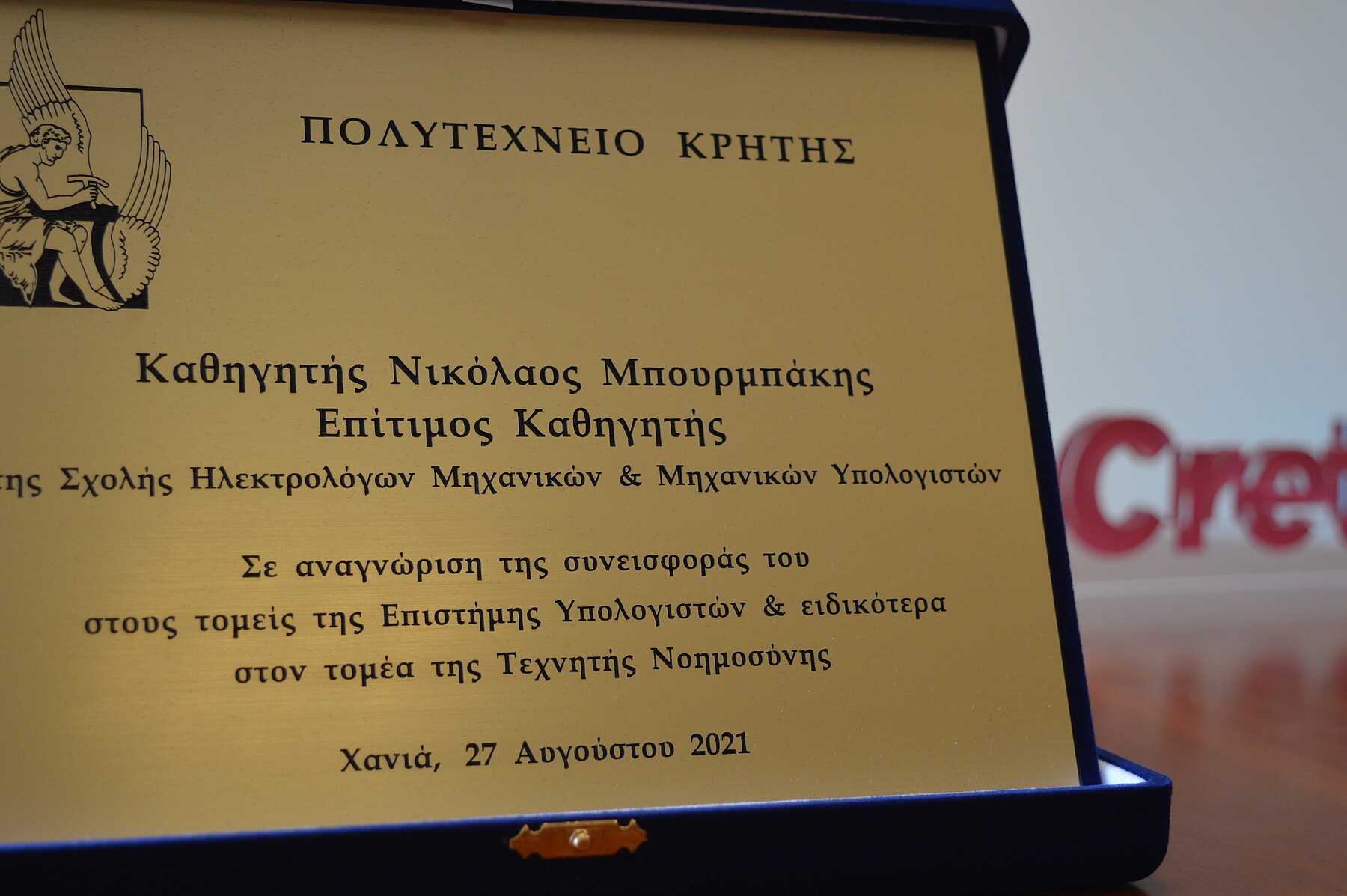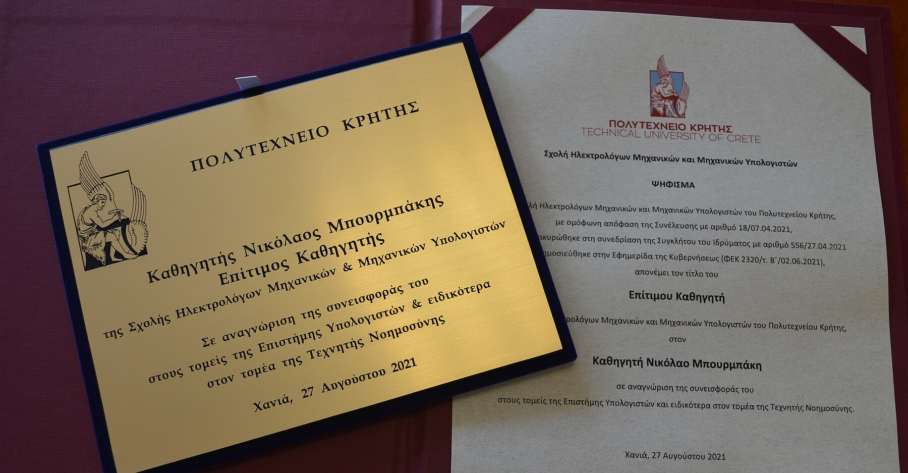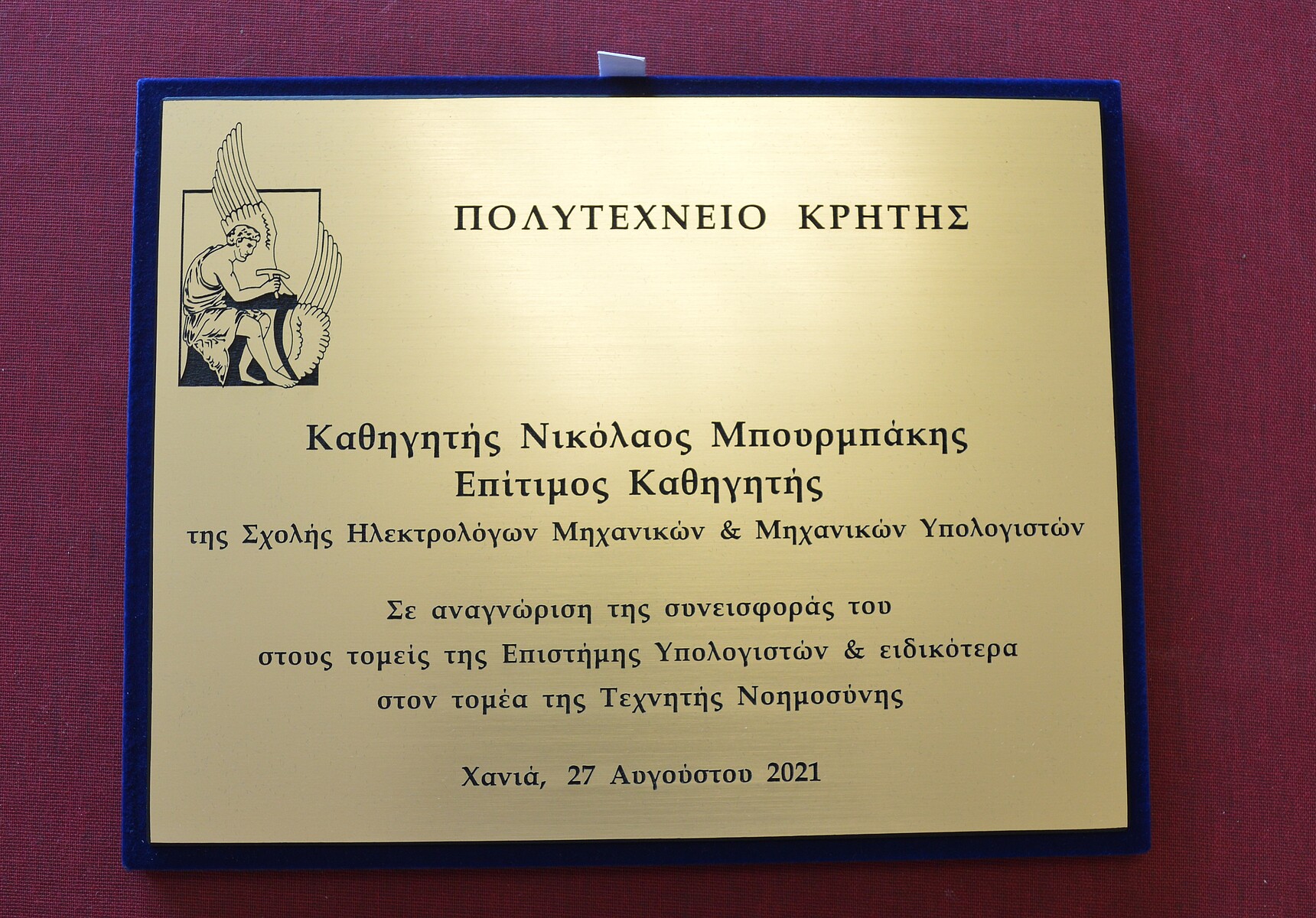 Την Παρασκευή 27 Αυγούστου 2021, στο πλαίσιο της Τελετής Απονομής Διπλωμάτων Μηχανικού του Πολυτεχνείου Κρήτης, πραγματοποιήθηκε ψηφιακά η Τελετή Αναγόρευσης του Καθηγητή Νικολάου Μπουρμπάκη σε Επίτιμο Καθηγητή της Σχολής Ηλεκτρολόγων Μηχανικών και Μηχανικών Υπολογιστών σε αναγνώριση της συνεισφοράς του στους τομείς της Επιστήμης Υπολογιστών και ειδικότερα στον τομέα της Τεχνητής Νοημοσύνης.