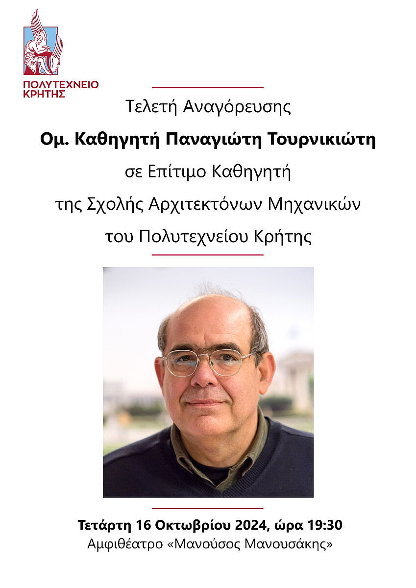 Η Τελετή Αναγόρευσης του Ομότιμου Καθηγητή Παναγιώτη Τουρνικιώτη σε Επίτιμο Καθηγητή της Σχολής Αρχιτεκτόνων Μηχανικών του Πολυτεχνείου Κρήτης θα πραγματοποιηθεί την Τετάρτη 16 Οκτωβρίου 2024 και ώρα 19:30 στο Αμφιθέατρο «Μανούσος Μανουσάκης» στην Πολυτεχνειούπολη.
