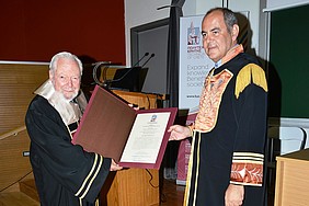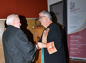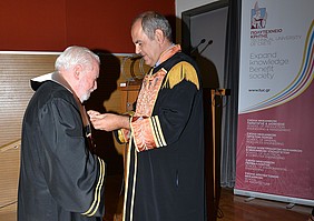 - Περιένδυση του τιμώμενου με την τήβεννο και το επιτηβέννιο του Ιδρύματος και επίδοση των τίτλων
