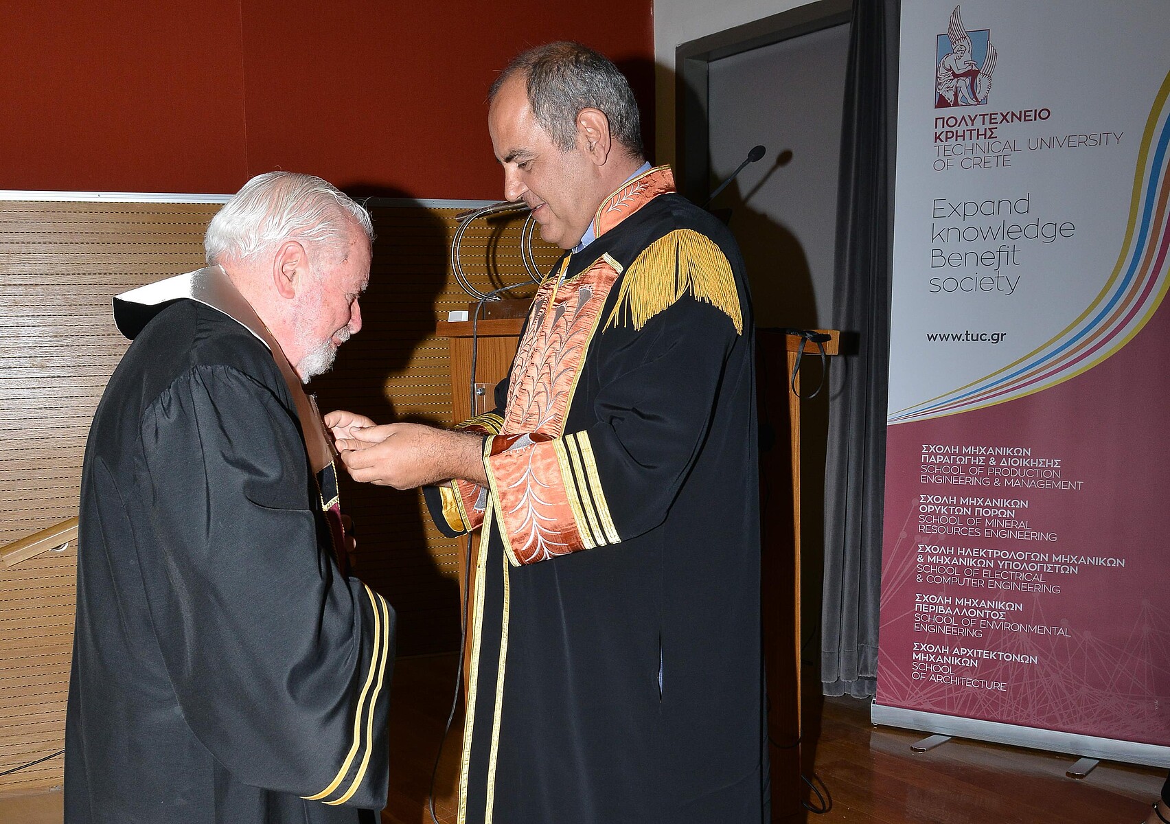 Την Πέμπτη 29 Ιουνίου 2017 & ώρα 12:00, στο αμφιθέατρο του Κτηρίου Επιστημών (141.Π.98) στην Πολυτεχνειούπολη, πραγματοποιήθηκε τελετή αναγόρευσης του Prof. George Tchobanoglous σε Επίτιμο Διδάκτορα της Σχολής Μηχανικών Περιβάλλοντος σε αναγνώριση της προσφοράς του στην Επιστήμη της Μηχανικής Περιβάλλοντος, και των πολύτιμων υπηρεσιών του στο Πολυτεχνείο Κρήτης.