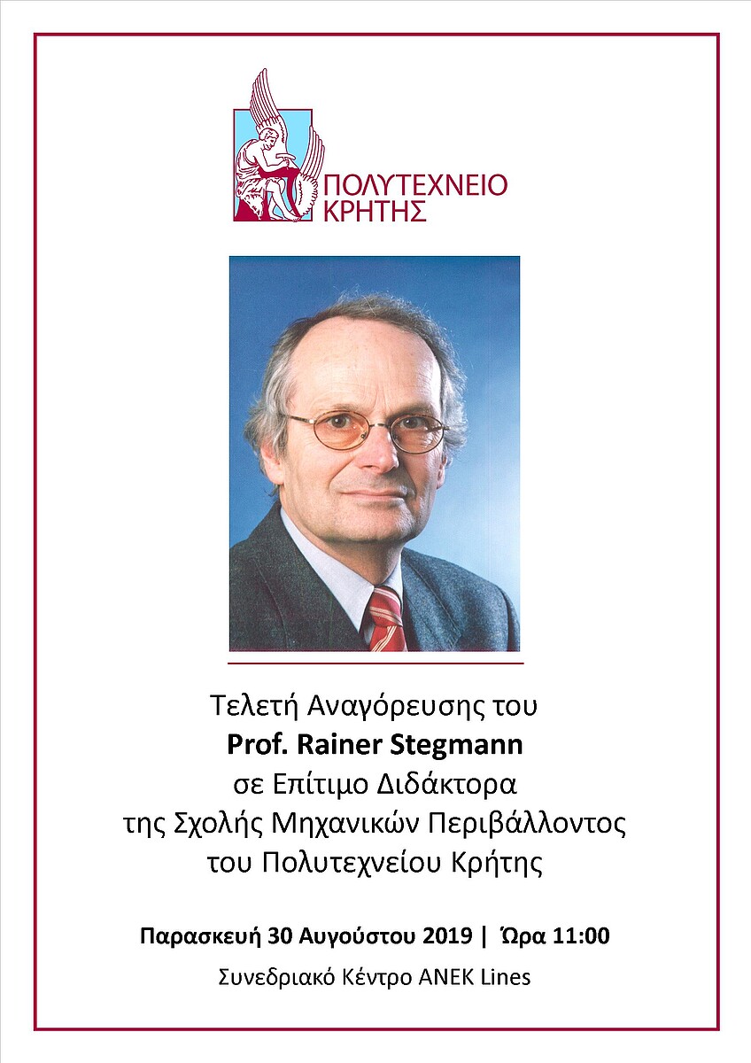Την Παρασκευή 30 Αυγούστου 2019 και ώρα 11:00, στο πλαίσιο της Τελετής Απονομής Διπλωμάτων Μηχανικού του Πολυτεχνείου Κρήτης στο Συνεδριακό Κέντρο ANEK Lines, θα πραγματοποιηθεί η Τελετή Αναγόρευσης του Prof. Rainer Stegmann σε Επίτιμο Διδάκτορα της Σχολής Μηχανικών Περιβάλλοντος σε αναγνώριση της προσφοράς του για την προαγωγή της έρευνας και της τεχνολογίας παγκοσμίως στον τομέα της Διαχείρισης Στερεών Αποβλήτων και της διαρκούς υποστήριξης των διδακτικών και ερευνητικών δραστηριοτήτων της Σχολής Μηχανικών Περιβάλλοντος του Πολυτεχνείου Κρήτης.