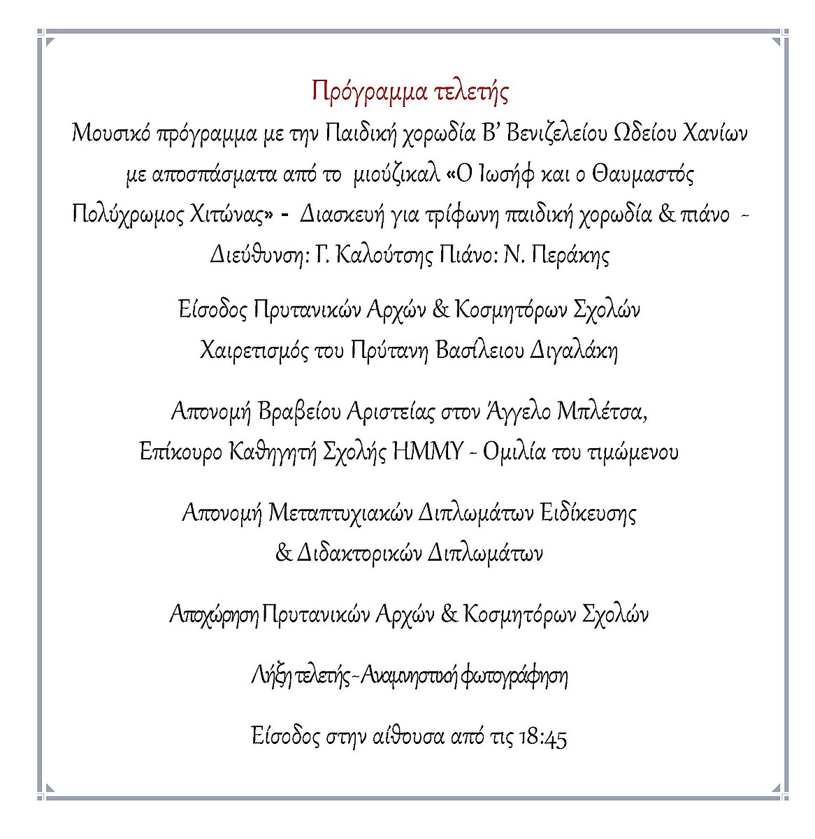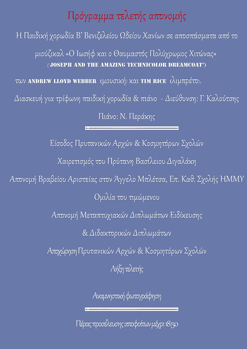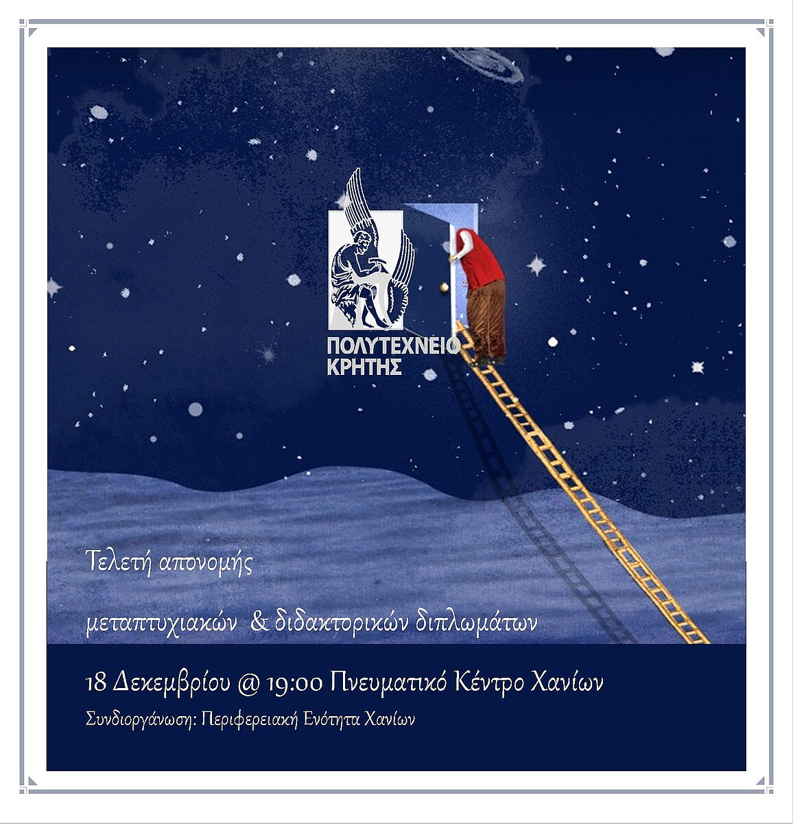 Η τελετή απονομής μεταπτυχιακών και διδακτορικών διπλωμάτων πρόκειται να πραγματοποιηθεί την Τετάρτη 18 Δεκεμβρίου 2013 και ώρα 7 το απόγευμα στην κεντρική αίθουσα του Πνευματικού Κέντρου Χανίων.