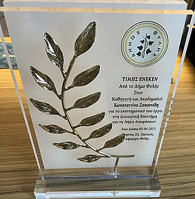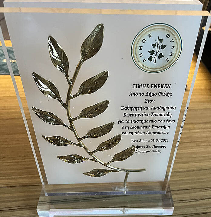 Στο πλαίσιο του Διιδρυματικού Προγράμματος Μεταπτυχιακών Σπουδών «Διοίκηση Επιχειρησιακών Λειτουργιών Πολιτισμού» μεταξύ του Πανεπιστημίου Δυτικής Αττικής (Τμήμα Διοίκησης Τουρισμού και Τμήμα Επιστημών Οίνου, Αμπέλου και Ποτών) και της Σχολής Μηχανικών Παραγωγής και Διοίκησης του Πολυτεχνείου Κρήτης, με την υποστήριξη του Δήμου Φυλής, ο Δήμαρχος Φυλής Χρήστος Παππούς απένειμε τιμητική πλακέτα στον Ακαδημαϊκό-Καθηγητή της Σχολής ΜΠΔ και του Audencia Business School, Κωνσταντίνο Ζοπουνίδη, για το επιστημονικό του έργο στη Διοικητική Επιστήμη και τη Λήψη Αποφάσεων.