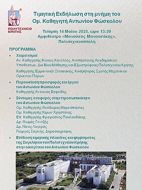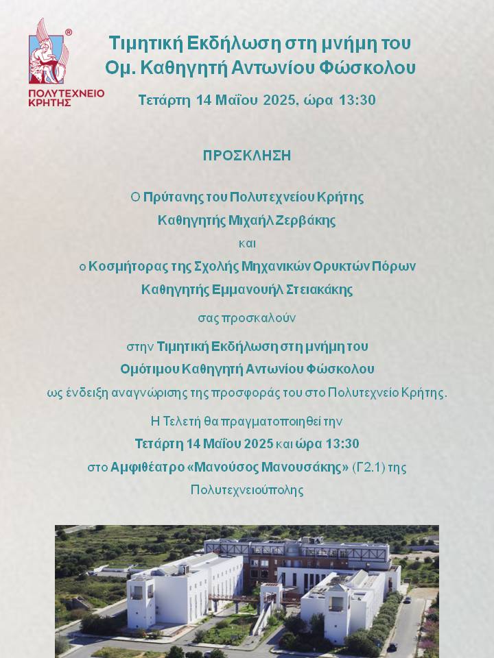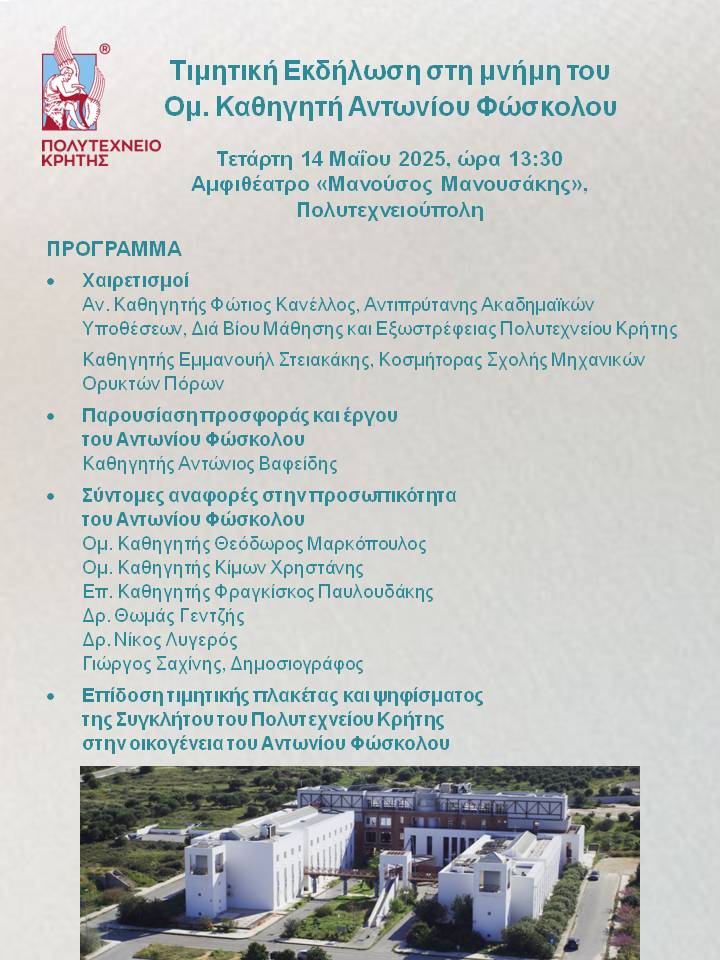 Τιμητική Εκδήλωση στη μνήμη του Ομότιμου Καθηγητή Αντωνίου Φώσκολου θα πραγματοποιηθεί την Τετάρτη 14 Μαΐου 2025 και ώρα 13:30 στο Αμφιθέατρο «Μανούσος Μανουσάκης» (Γ2.1) της Πολυτεχνειούπολης, ως ένδειξη αναγνώρισης της προσφοράς του στο Πολυτεχνείο Κρήτης.