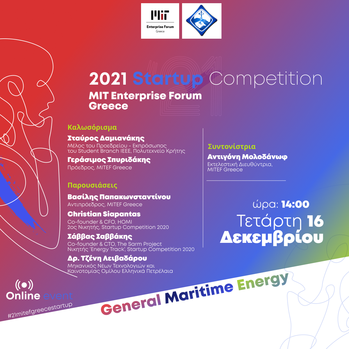 Σκοπός της εκδήλωσης είναι η ενημέρωση ερευνητών και νεοφυών επιχειρήσεων σχετικά με το διαγωνισμό “MITEF Greece Startup Competition 2021”, που στοχεύει στη δυναμική ανάπτυξη νεοφυών επιχειρήσεων και επιχειρηματικών ομάδων που καινοτομούν στο χώρο της τεχνολογίας και των επιστημών. Οι ομάδες που θα βραβευθούν, θα προβληθούν διεθνώς μέσα από το δίκτυο του MIT Enterprise Forum. Ο διαγωνισμός περιλαμβάνει 3 θεματικές ενότητες: «General», «Energy» και «Maritime».