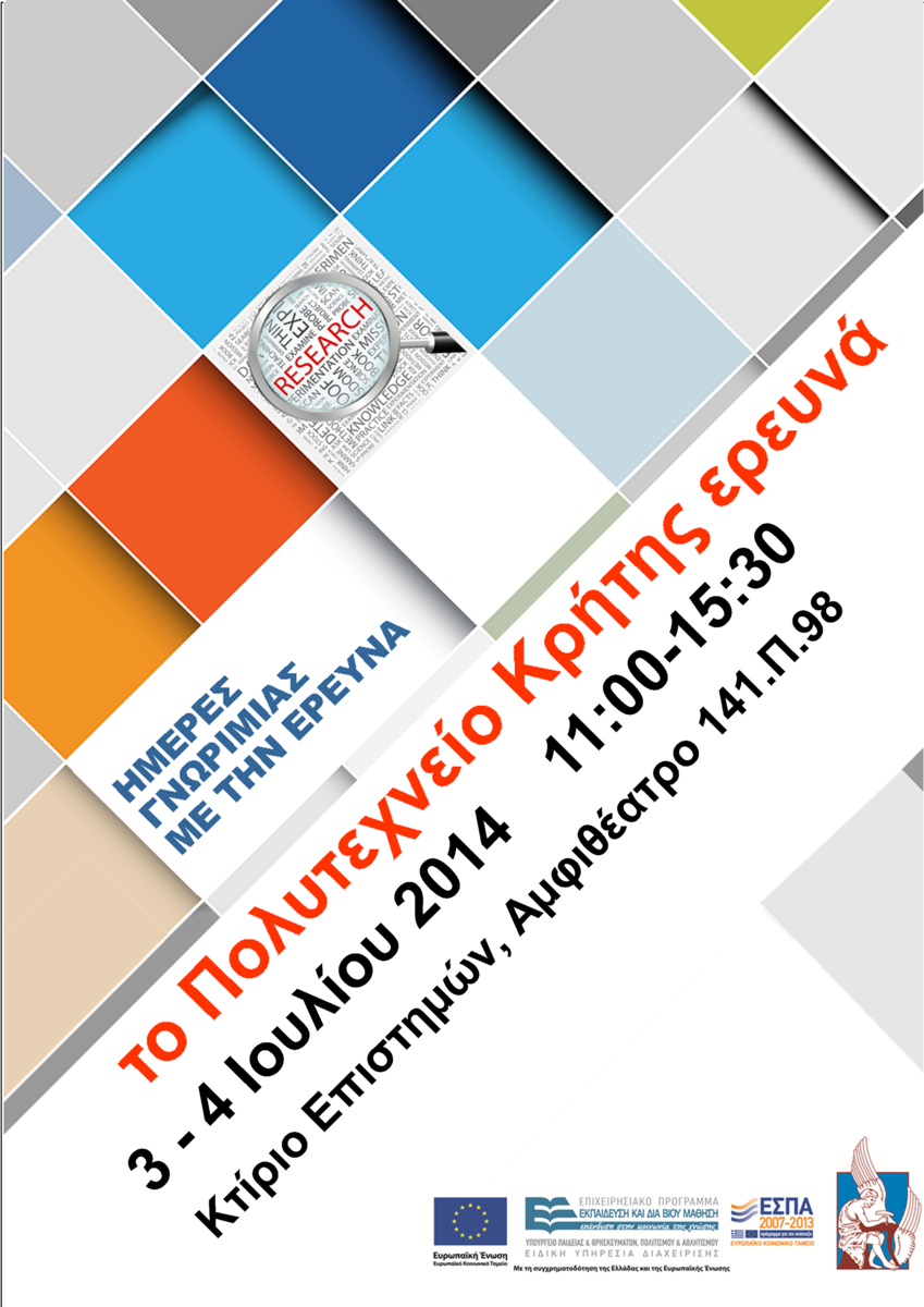 Το Πολυτεχνείο Κρήτης διοργανώνει εκδήλωση στις 3 και 4 Ιουλίου 2014 με τίτλο «Το Πολυτεχνείο Κρήτης ερευνά». Η εκδήλωση πραγματοποιείται στα πλαίσια του ερευνητικού προγράμματος “ΗΡΑΚΛΕΙΤΟΣ ΙΙ - Ενίσχυση του ανθρώπινου ερευνητικού δυναμικού μέσω της υλοποίησης διδακτορικής έρευνας”. Στόχος είναι η παρουσίαση της έρευνας που πραγματοποιείται στο Πολυτεχνείο Κρήτης των υποτρόφων του προγράμματος Ηράκλειτος ΙΙ, καθώς και της έρευνας που πραγματοποιείται στα πλαίσια άλλων ερευνητικών προγραμμάτων, ή στα πλαίσια διδακτορικής και μετα-διδακτορικής έρευνας.