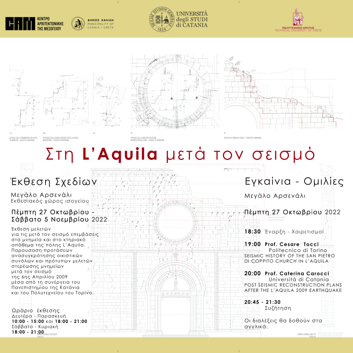 Το Εργαστήριο Τεκμηρίωσης και Αποκατάστασης Ιστορικών Κτηρίων και Συνόλων της Σχολής Αρχιτεκτόνων Μηχανικών του Πολυτεχνείου Κρήτης με το Κέντρο Αρχιτεκτονικής Μεσογείου του Δήμου Χανίων, σε συνέργεια με τη Σχολή Αρχιτεκτόνων των Συρακουσών –Università di Catania– οργανώνουν έκθεση σχετική με την έρευνα και τη διδασκαλία που αφορούσαν στους σχεδιασμούς για την περιοχή της L’ Aquila μετά τον σεισμό της 6ης Απριλίου 2009. Η έκθεση θα διαρκέσει από 27 Οκτωβρίου 2022 έως και 5 Νοεμβρίου 2022.