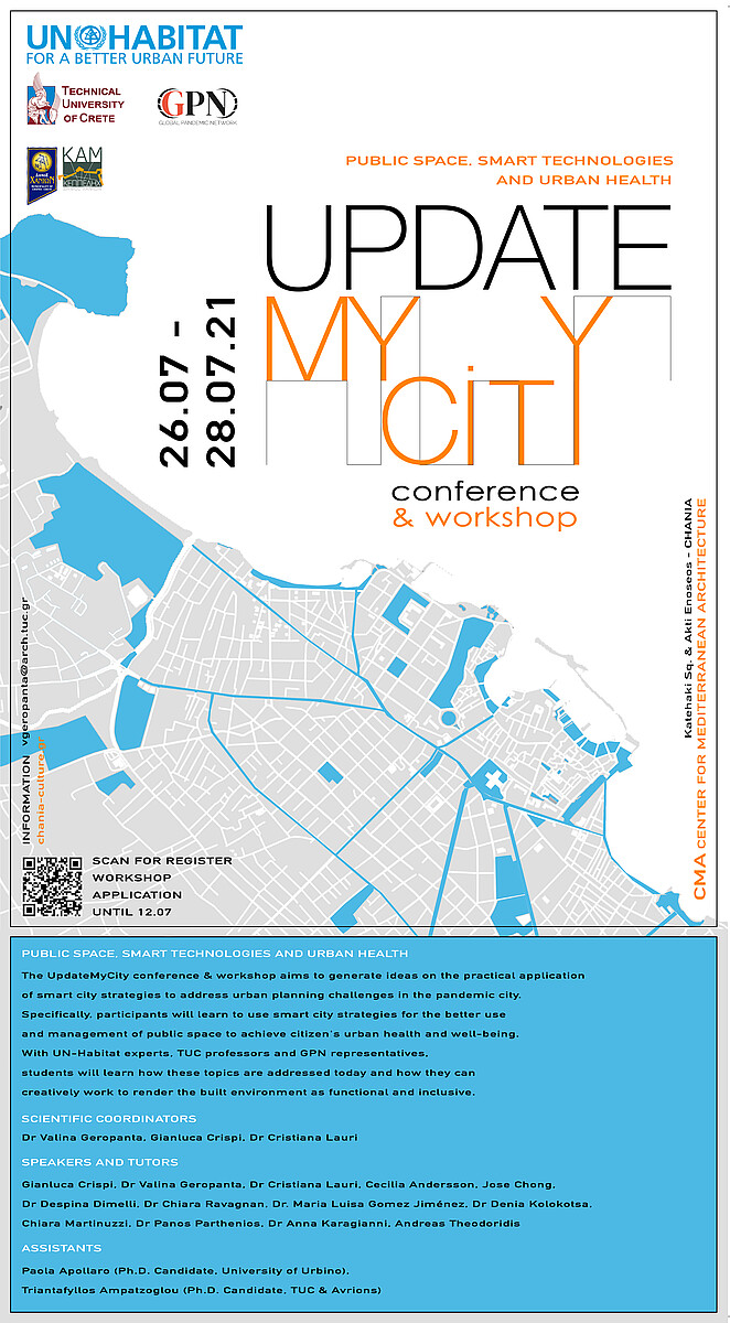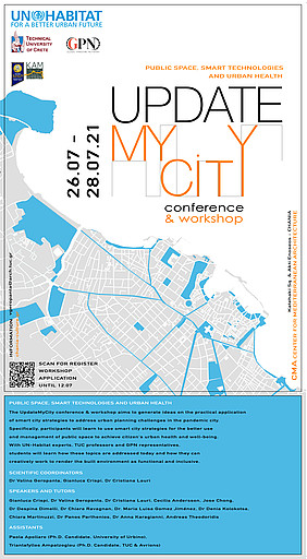 Το Συνέδριο και Εργαστήριο UpdateMyCity [UpdateMyCity Conference and Workshop: Public Space, Smart Technologies and Urban Health] στοχεύει στην παραγωγή ιδεών σχετικά με την πρακτική εφαρμογή τοπικών στρατηγικών έξυπνης πόλης για την επίλυση των προκλήσεων πολεοδομικού σχεδιασμού στην πανδημική πόλη. Συγκεκριμένα αφορά τον ανασχεδιασμό του δημόσιου χώρου με τη χρήση νέων τεχνολογιών και στόχο την επίτευξη αστικής υγείας. Στο πλαίσιο αυτό θα δημιουργηθούν στρατηγικές για την καλύτερη χρήση του δημοσίου χώρου των Χανίων, η ανάπτυξη νέων, καινοτόμων σεναρίων για το μέλλον του, επανεκτιμώντας την δυνατότητα επανάχρησης και ευέλικτης διαχείρισής του.