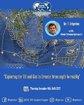 Το φοιτητικό παράρτημα της Διεθνούς Κοινότητας Μηχανικών Πετρελαίου στο Πολυτεχνείο Κρήτης TUC SPE Student Chapter έχει την χαρά και την τιμή να διοργανώνει, την Πέμπτη 10 Δεκεμβρίου 2020 και ώρα 18.00, webinar με θέμα: "Exploring for Oil and Gas in Greece: from myth to reality" με ομιλητή τον κ. Ιωάννη Γρηγορίου πρώην CEO της εταιρείας Ελληνικά Πετρέλαια Α.Ε., με εμπειρία 40 ετών στην Πετρελαϊκή Βιομηχανία.