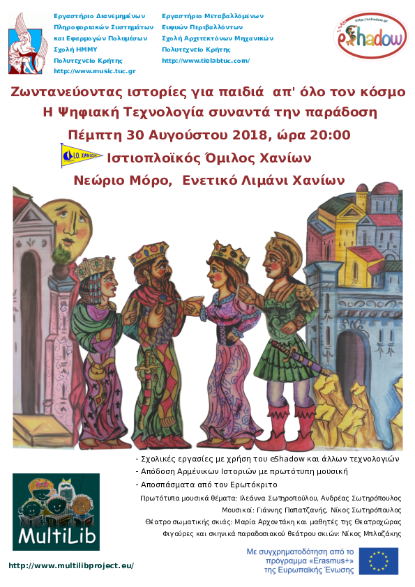 Την Πέμπτη 30 Αυγούστου 2018 στο καφέ του Ιστιοπλοϊκού Ομίλου Χανίων πραγματοποιήθηκε εκδήλωση όπου παρουσιάστηκαν τα αποτελέσματα από την αξιοποίηση του Ψηφιακού Θεάτρου Σκιών (http://www.eshadow.gr/) σε σχολεία των Χανίων καθώς και από την χρήση ψηφιακών τεχνολογιών εν γένει από μαθητές για να ζωντανέψουν παραδοσιακές και σύγχρονες ιστορίες. Επίσης, παρουσιάσιηκαν, με τη σύμπραξη καλλιτεχνών, πρωτότυπα μουσικά θέματα για την απόδοση Αρμένικων Ιστοριών και δραματοποιημένα αποσπάσματα από τον Ερωτόκριτο. Στο τέλος της εκδήλωσης δόθηκε η δυνατότητα στους συμμετέχοντες να δοκιμάσουν τη νέα έκδοση του Ψηφιακού Θεάτρου Σκιών eShadow με ψηφιακές εκδόσεις από φιγούρες του Ερωτόκριτου που έχει δημιουργήσει ο Χανιώτης καλλιτέχνης κ. Νίκος Μπλαζάκης.