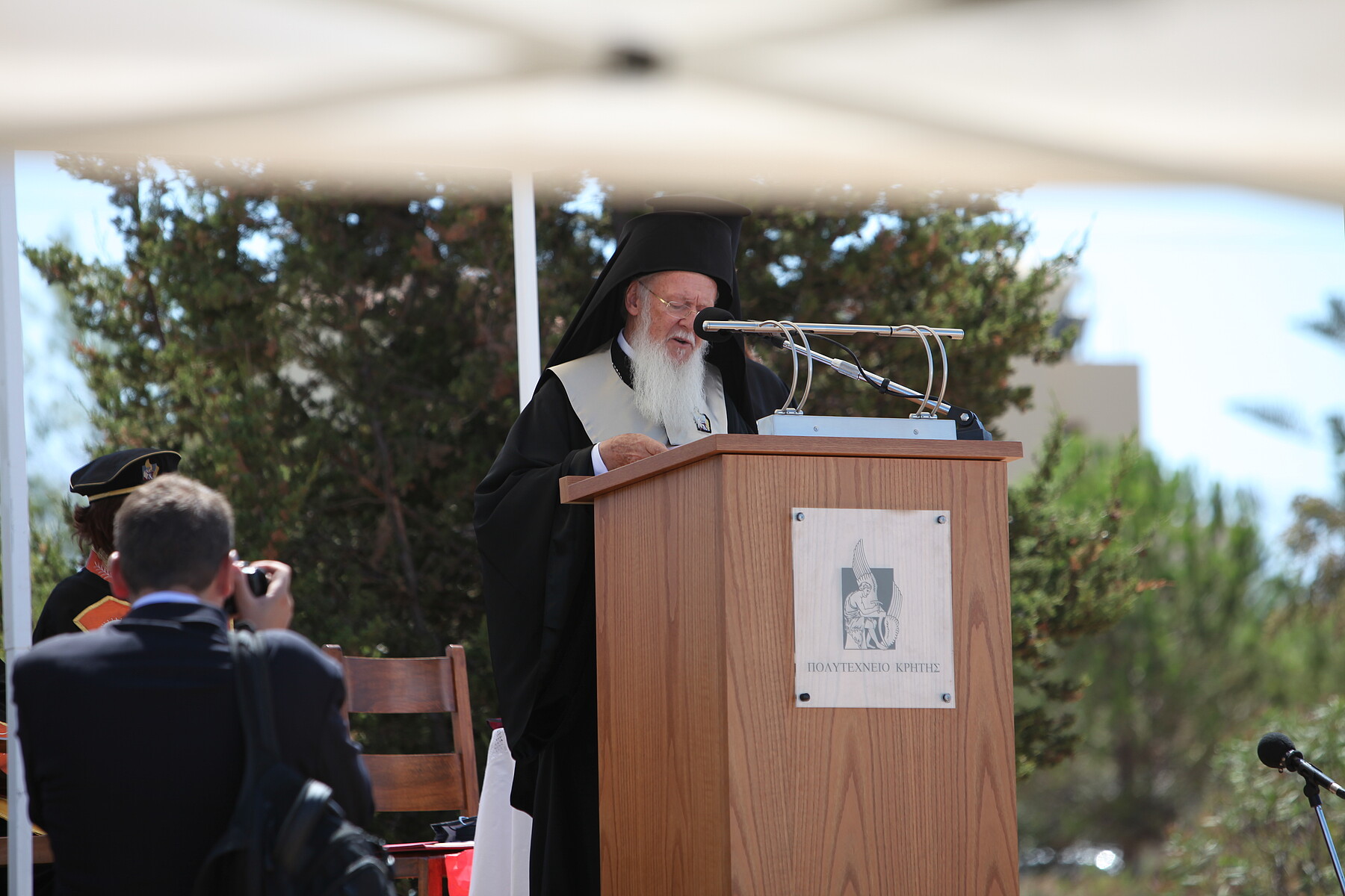 Κατά τη διάρκεια της ομιλίας του, ο Οικουμενικός Πατριάρχης εξήρε το έργο του Πολυτεχνείου Κρήτης, ενώ παράλληλα τόνισε τη σημαντικότητα της προστασίας του περιβάλλοντος.