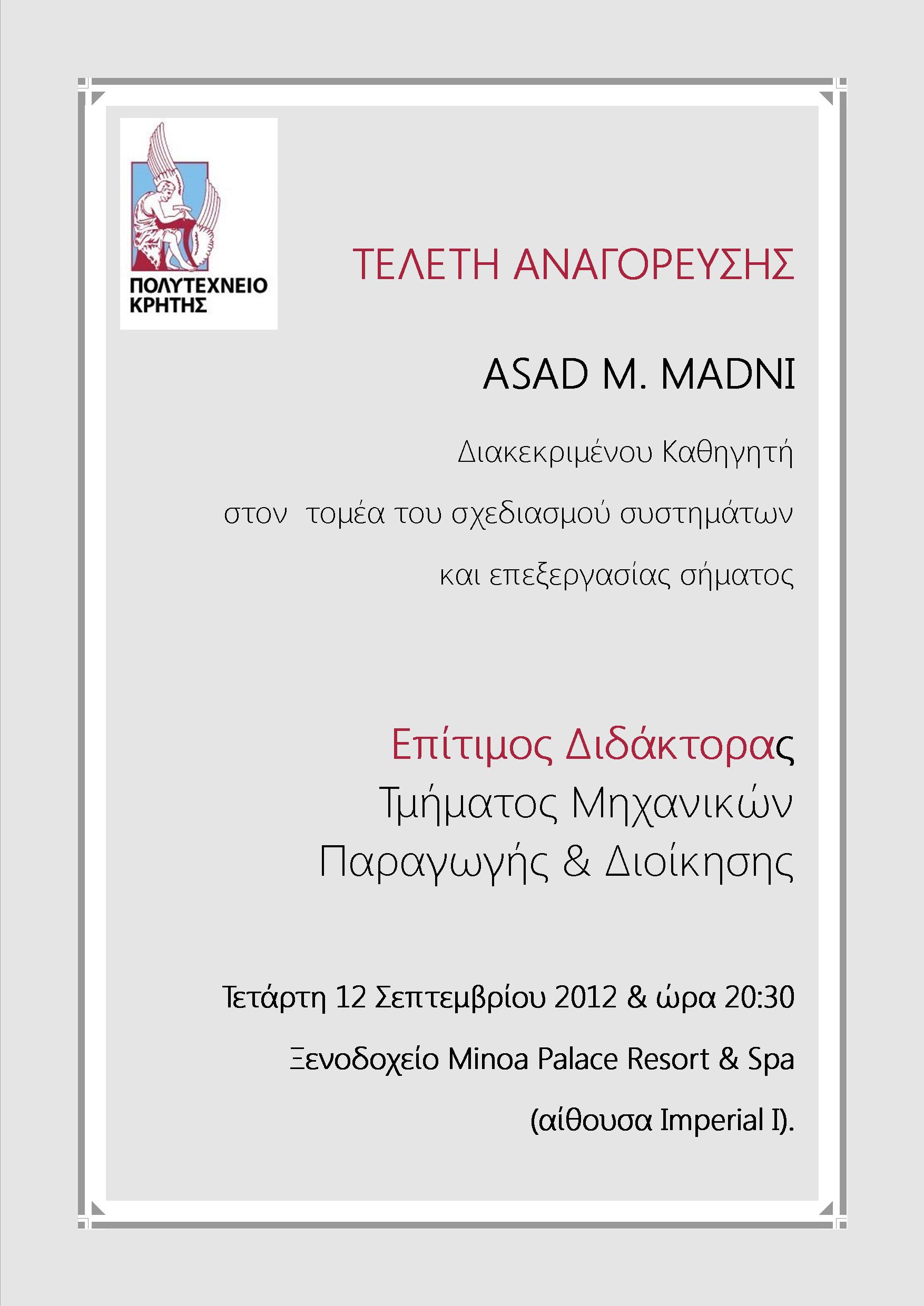 Η υποψηφιότητα του Dr. Asad Μάντνι για την απονομή του επίτιμου διδακτορικού διπλώματος για την εξαιρετική συμβολή του στον τομέα του σχεδιασμού συστημάτων και της επεξεργασίας σήματος ψηφίστηκε ομόφωνα από τη Γενική Συνέλευση του Τμήματος Μηχανικών Παραγωγής και Διοίκησης του Πολυτεχνείου Κρήτης .