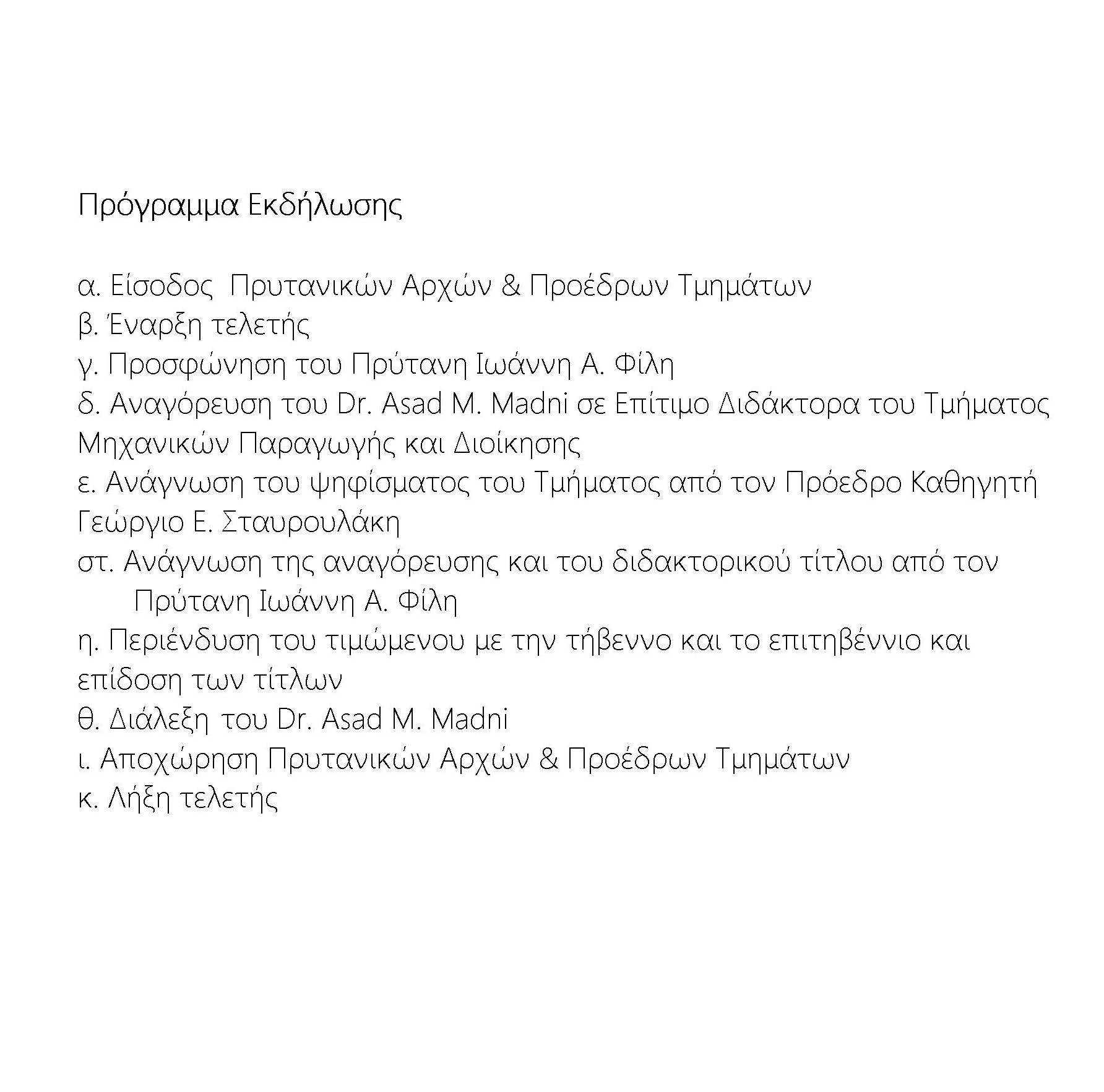 Στην προσφώνησή του, ο Πρύτανης Γιάννης Φίλης εξήρε την προσωπικότητα του Dr. Asad Madni αναφέροντας μεταξύ άλλων: