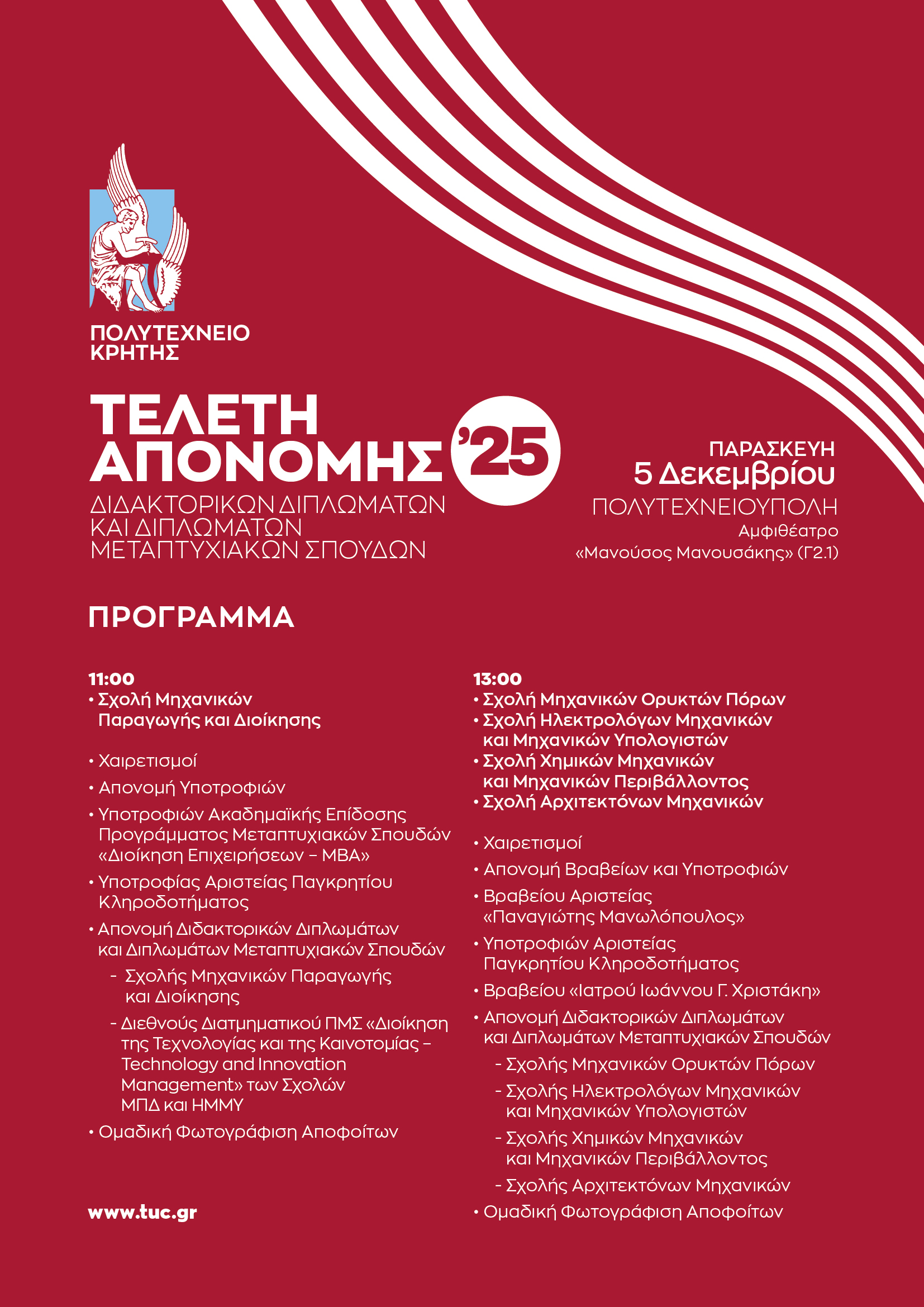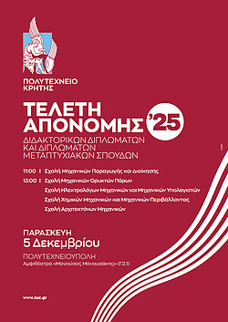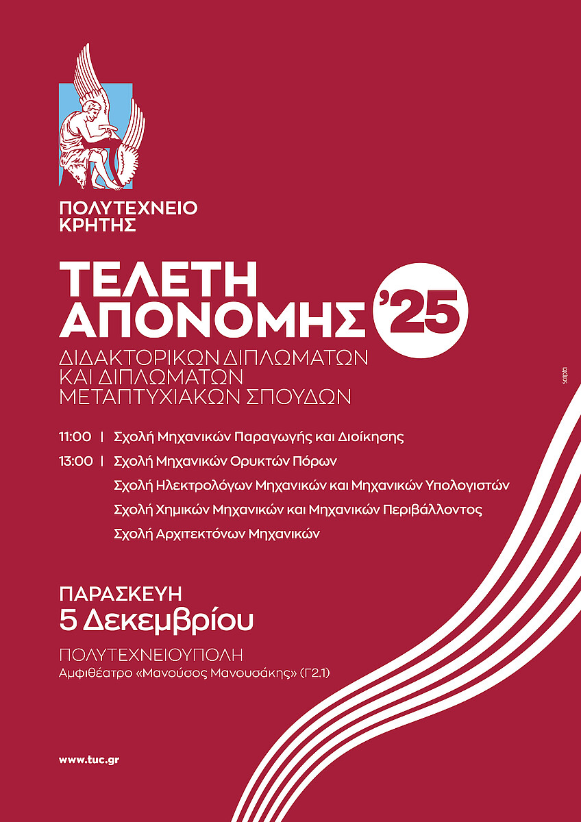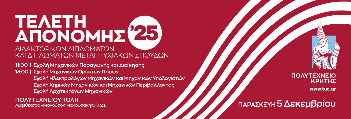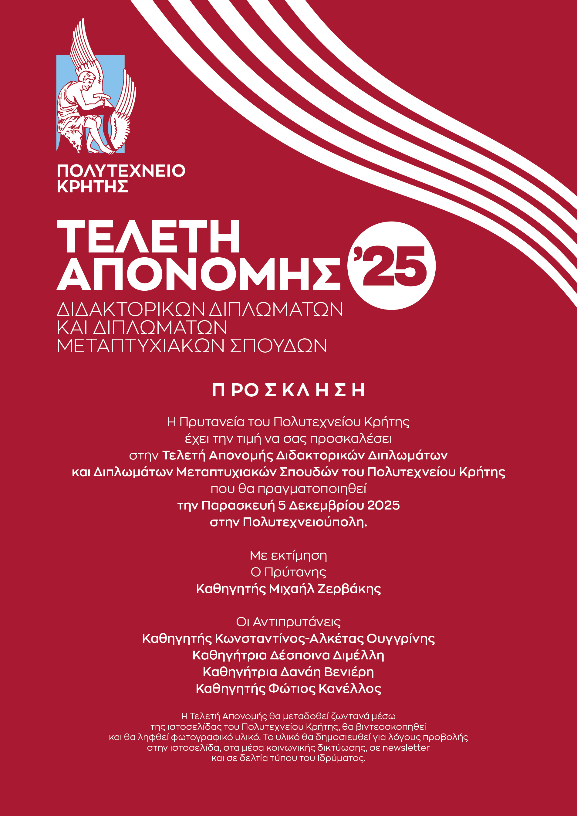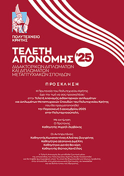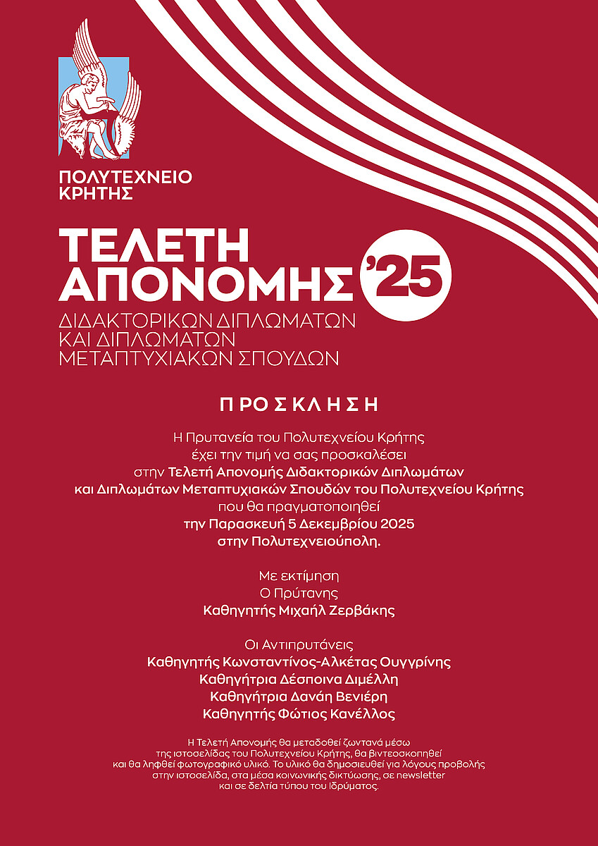 Η Τελετή Aπονομής Διδακτορικών Διπλωμάτων και Διπλωμάτων Mεταπτυχιακών Σπουδών του Πολυτεχνείου Κρήτης για το ακαδημαϊκό έτος 2024-2025 θα πραγματοποιηθεί την Παρασκευή 5 Δεκεμβρίου 2025 στο Αμφιθέατρο «Μανούσος Μανουσάκης» (Γ2.1) της Πολυτεχνειούπολης.