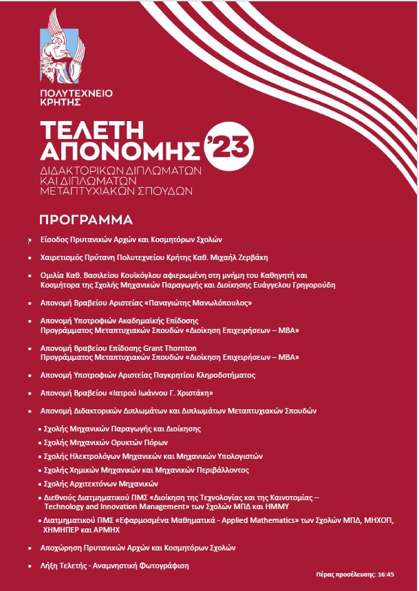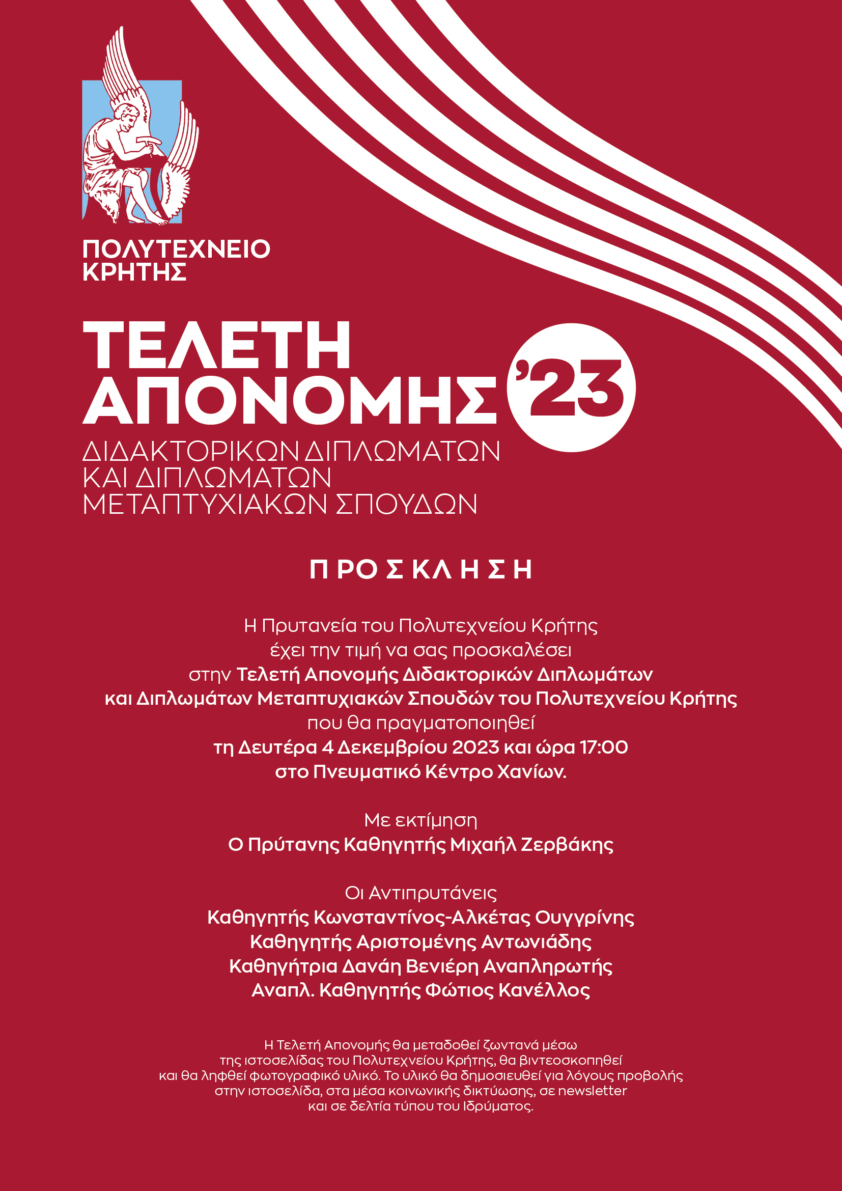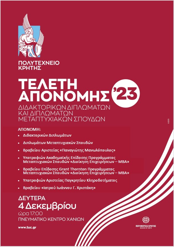 Η Τελετή Aπονομής Διδακτορικών Διπλωμάτων και Διπλωμάτων Mεταπτυχιακών Σπουδών 2023 θα πραγματοποιηθεί τη Δευτέρα 4 Δεκεμβρίου 2023 και ώρα 17:00 στο Πνευματικό Κέντρο Χανίων.