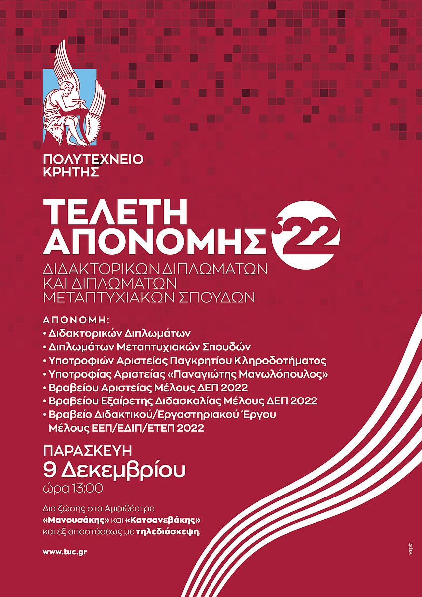Η Τελετή Aπονομής Διδακτορικών Διπλωμάτων και Διπλωμάτων Mεταπτυχιακών Σπουδών 2022 θα πραγματοποιηθεί υβριδικά (διά ζώσης και με τηλεδιάσκεψη) την Παρασκευή 9 Δεκεμβρίου 2022 και ώρα 13:00. Η τελετή θα πραγματοποιηθεί με φυσική παρουσία στα Αμφιθέατρα «Μανούσος Μανουσάκης» και «Γεώργιος Κατσανεβάκης» στην Πολυτεχνειούπολη με παράλληλη δυνατότητα σύνδεσης εξ αποστάσεως μέσω τηλεδιάσκεψης.