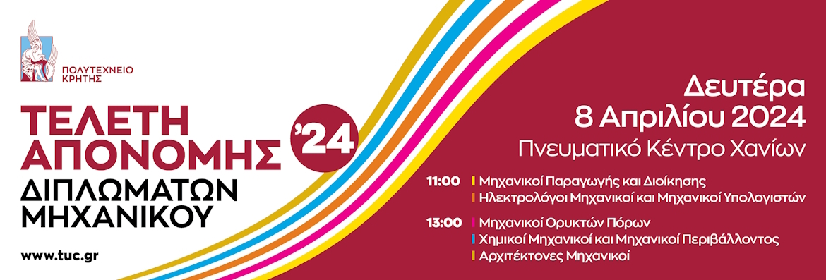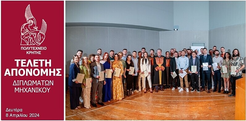 Σε πολύ ευχάριστο και εορταστικό κλίμα πραγματοποιήθηκε η Τελετή Απονομής Διπλωμάτων Μηχανικού του Πολυτεχνείου Κρήτης για την ανακήρυξη της εξεταστικής του χειμερινού εξαμήνου του ακαδημαϊκού έτους 2023-2024, τη Δευτέρα 8 Απριλίου 2024 στο Πνευματικό Κέντρο Χανίων.