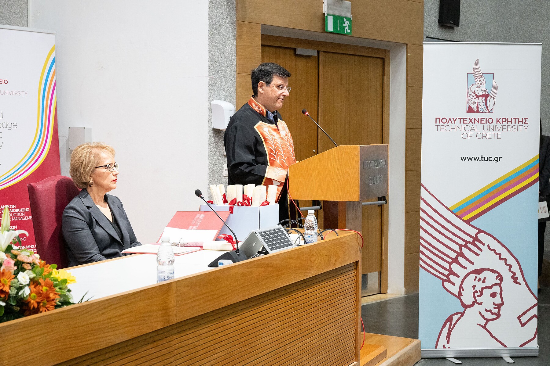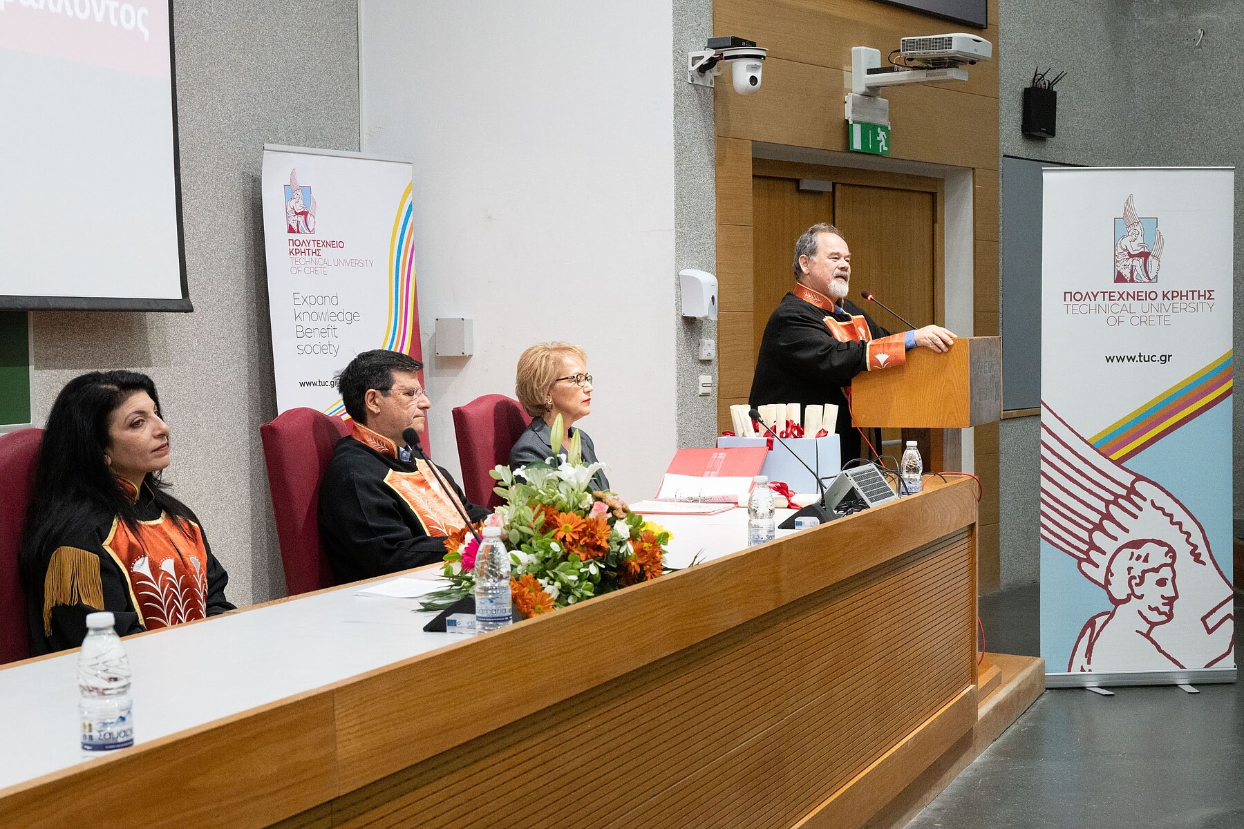 Κατά την έναρξη της Τελετής, απηύθυνε χαιρετισμό, εκπροσωπώντας την Πρυτανεία του Ιδρύματος, ο Αντιπρύτανης Έρευνας και Καινοτομίας του Πολυτεχνείου Κρήτης Καθηγητής Κωνσταντίνος-Αλκέτας Ουγγρίνης.
