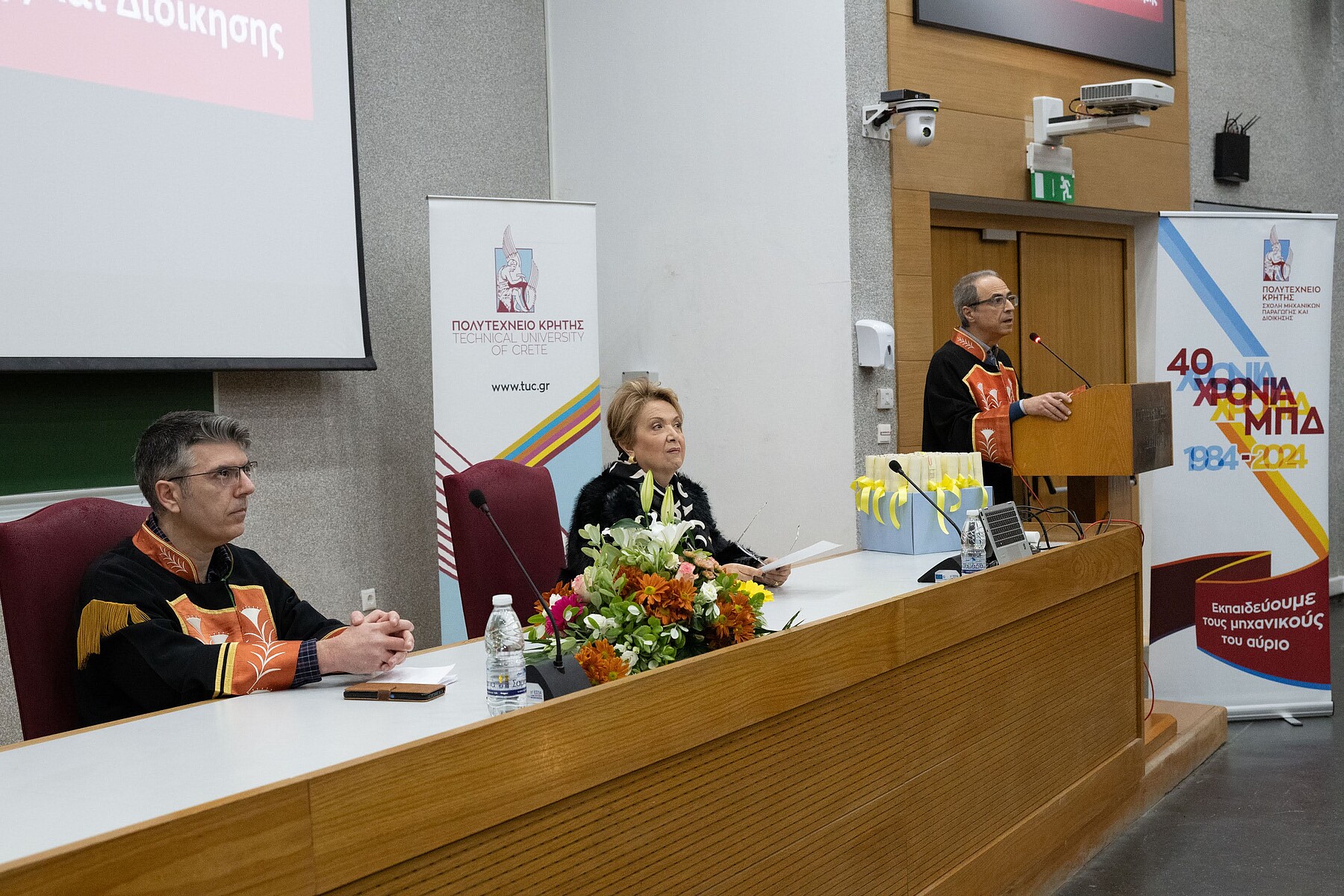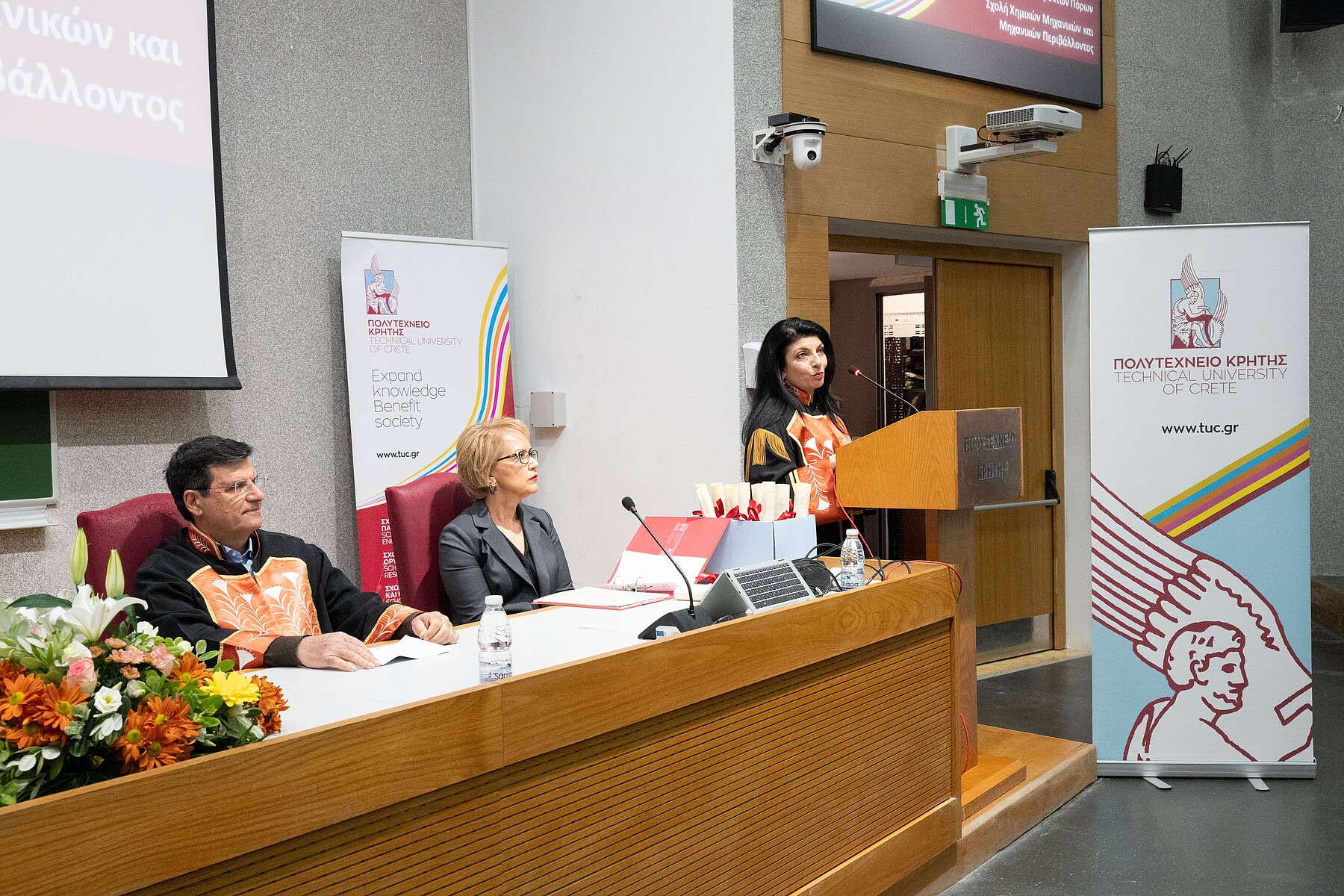 Κατά την έναρξη της Τελετής, απηύθυνε χαιρετισμό, εκπροσωπώντας την Πρυτανεία του Ιδρύματος, η Αντιπρύτανις Οικονομικών και Ανάπτυξης του Πολυτεχνείου Κρήτης Καθηγήτρια Δανάη Βενιέρη .